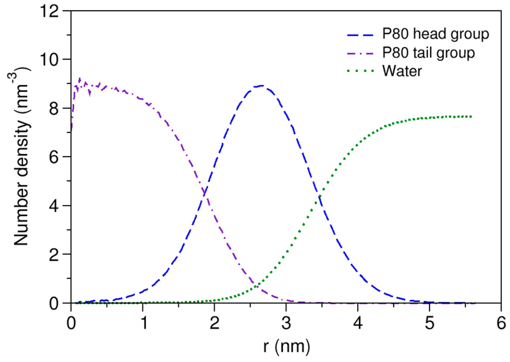 Density distribution of water and head and tail of P80 from micelle center of mass.