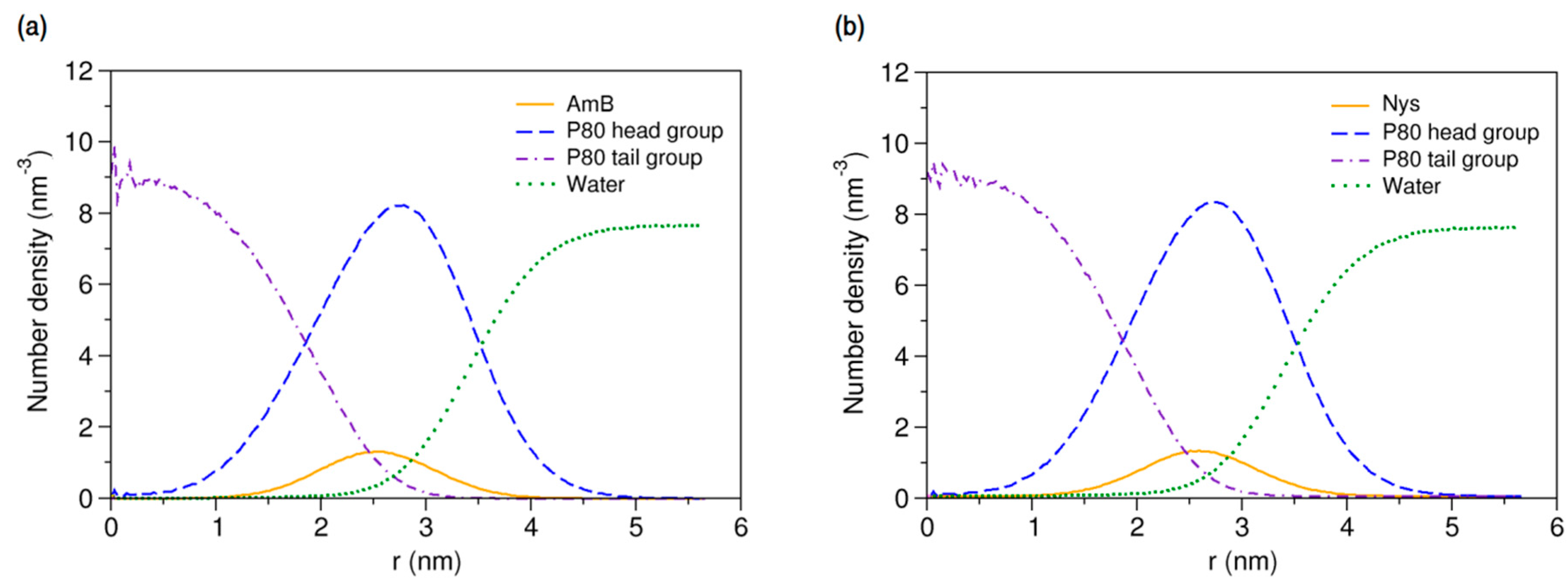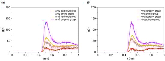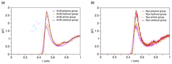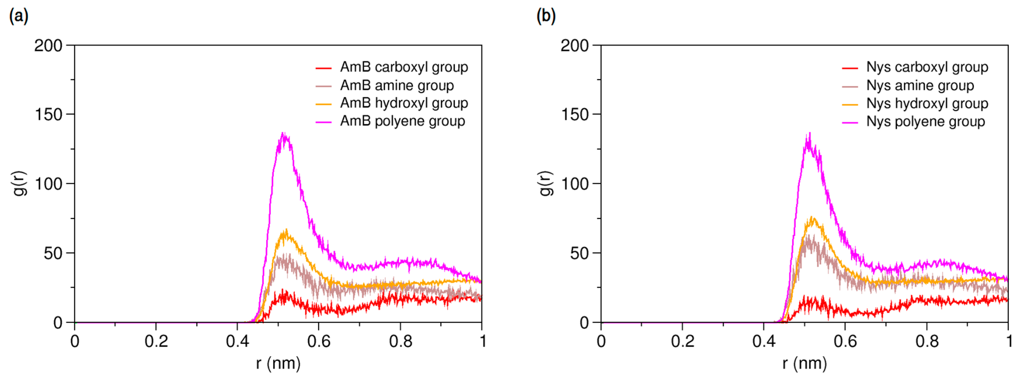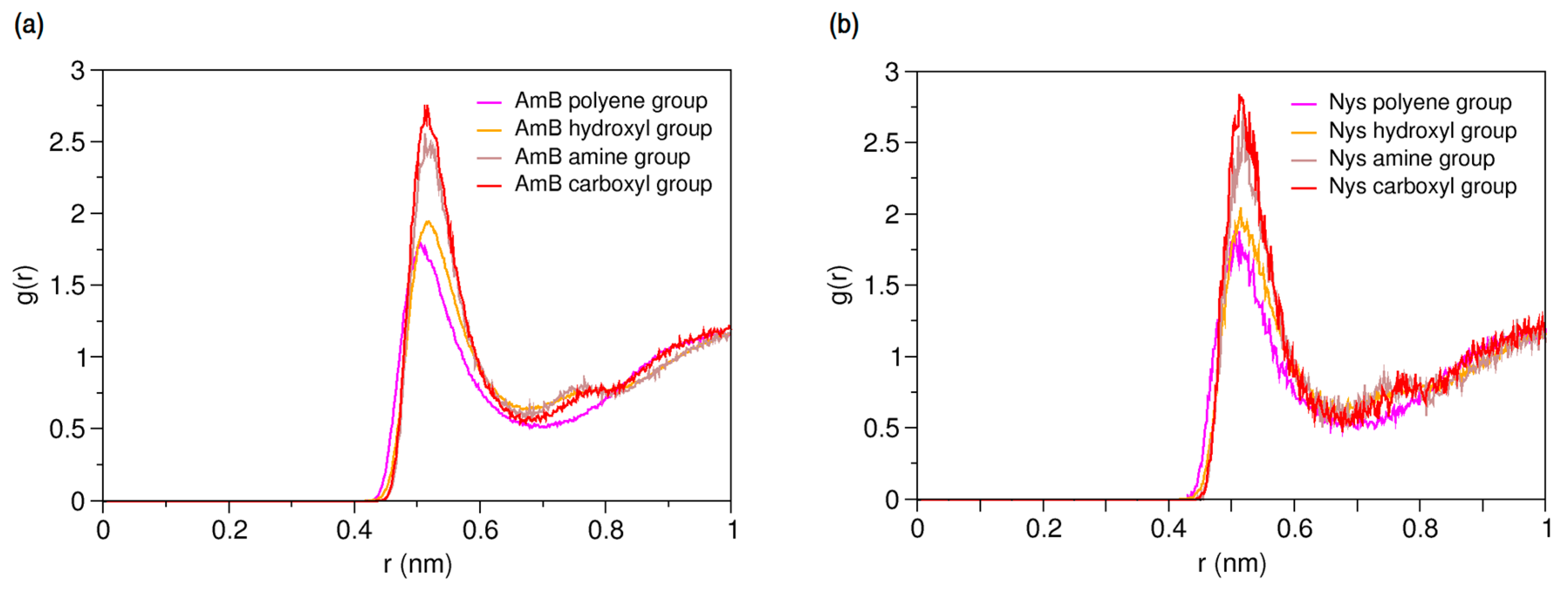 Average radial pair distribution functions for various moieties of (a) a single Amphotericin B (AmB) molecule; and (b) a single Nystatin (Nys) molecule against water particles.