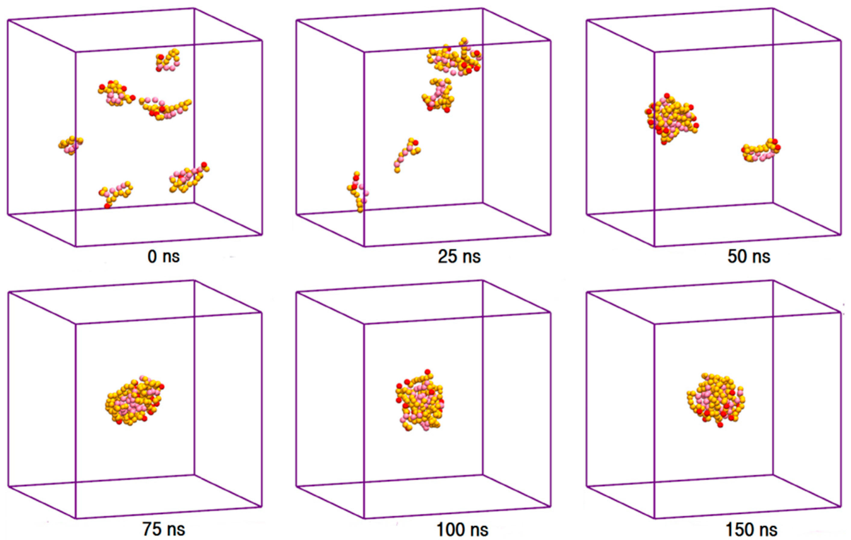 Trajectory snapshots of aggregation of AmB in the aqueous medium at different simulation times (water particles have been removed for clarity).