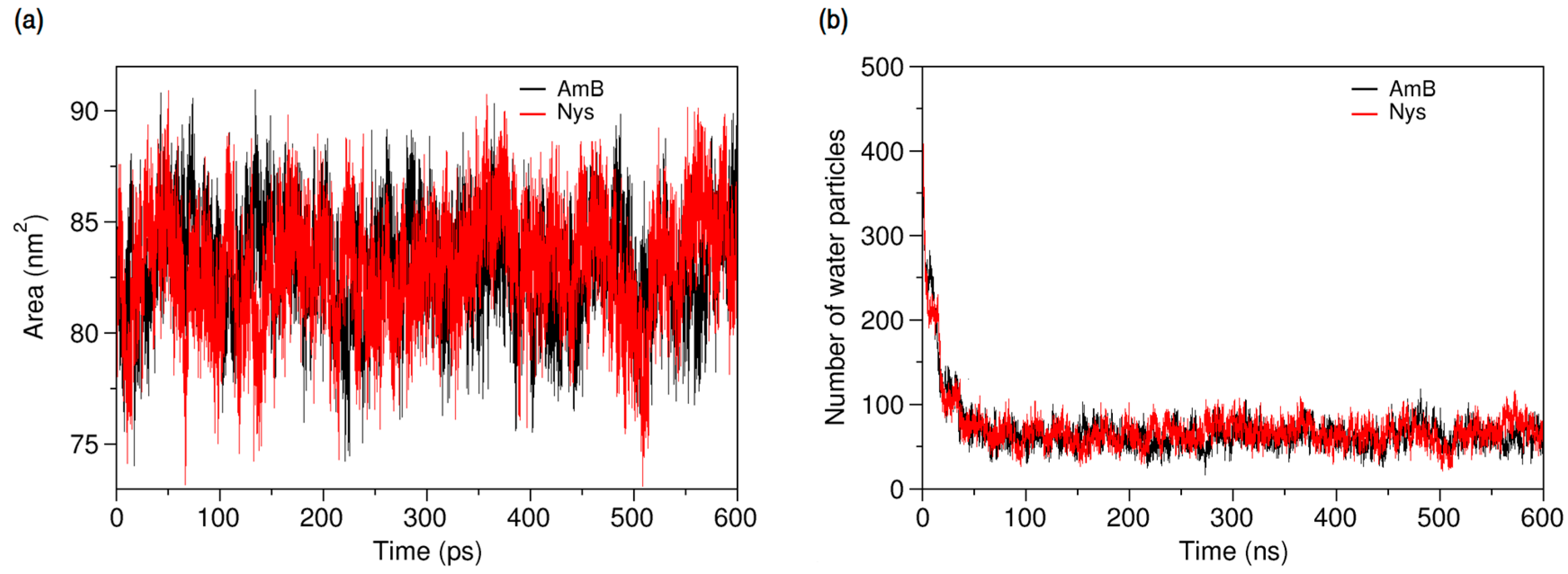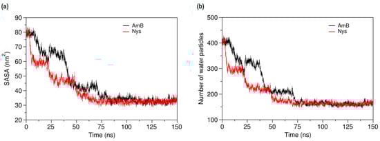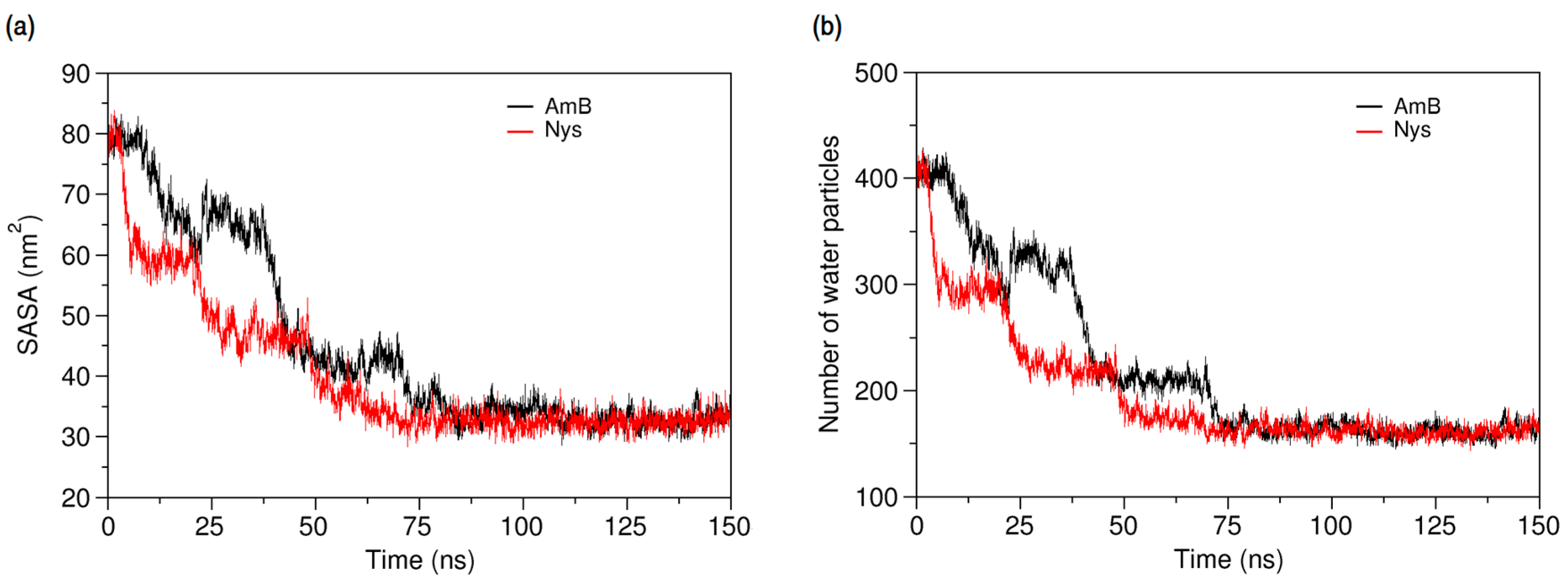 Aggregation of hydrophobic molecules in the aqueous media is known to be driven by unfavorable contacts between water and their hydrophobic domains [1,3,84]. It has been shown that as the self-association proceeds, the solvent accessible surface area (SASA) of the hydrophobic solute is constantly limited in a linear correlation with the unfavorable contacts [46,84,85]. Thereby, the SASA can be used for semi-quantitatively tracking the self-aggregation of non-soluble agents in the aqueous solvent. To quantify the progress of AmB and Nys self-association (1 w%), we calculated their SASA and the average number of water particles around each PA molecule within the first hydration shell (7 Å) over the simulation period. Figure 5a presents the SASA profile of PAs and Figure 5b shows average number of water particles around PA molecules observed from a sample simulation of 9 molecules of each drug at identical initial configurations. The SASA profiles exhibit declining trend with the simulation time, indicating that the self-aggregation proceeds by the tendency of PAs to protect their hydrophobic moieties from water.