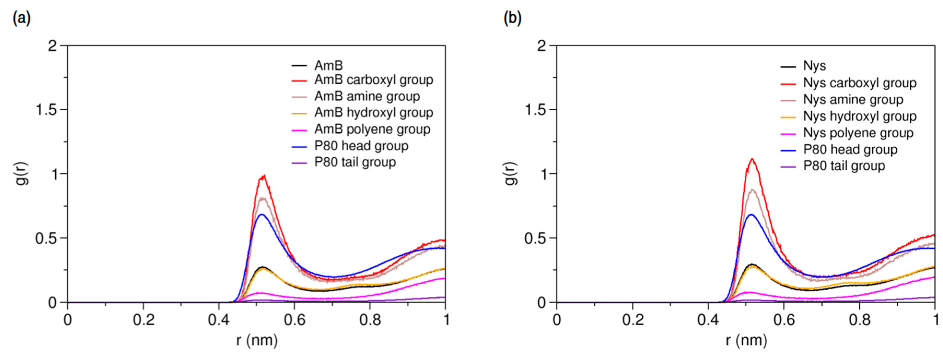 Average radial pair distribution functions for various moieties of (a) AmB; and (b) Nys against single P80 molecule in aqueous medium.