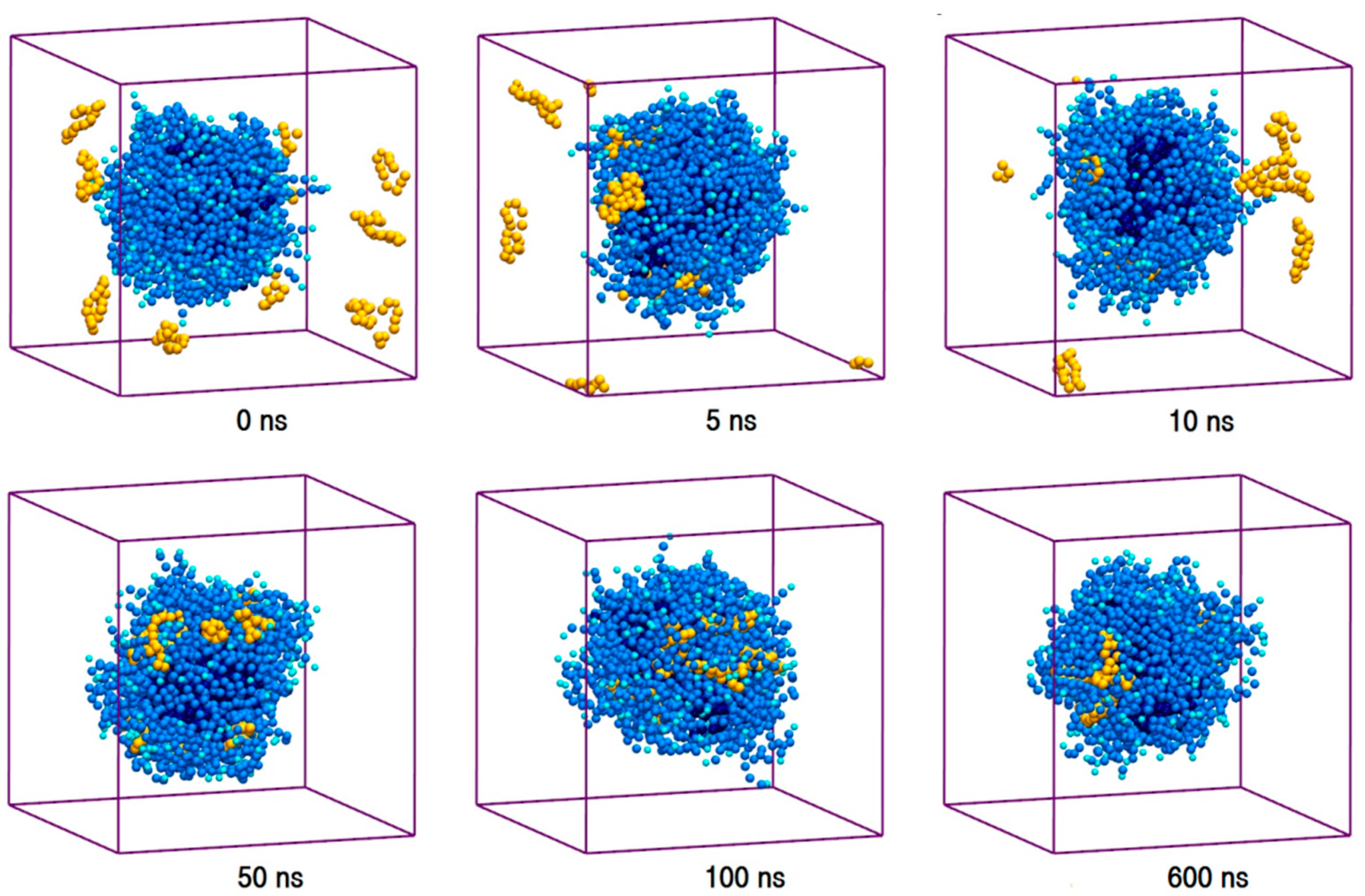 Rational development of pharmaceutical formulations is being increasingly aided by in silico methods [38,39,40,41]. Specifically, molecular dynamics (MD) simulation has proven powerful in providing molecular-level insight into drug-expedient interactions, particularly in those aspects not able to be readily explored by routine experimental techniques [39,41,42]. There are intriguing success stories of MD simulations use in drug formulation research, having provided insights into the location and mode of distribution of drug molecules in the vehicles [42], morphology of drug-loaded particles [43], aggregation behavior and mechanism of toxicity of drugs in presence of excipients [44], mechanisms, driving forces, and loading efficiency of drug encapsulation in carriers [45,46], and efficiency of particular formulations for solubilized drug delivery [46,47]. These studies have attracted attention to the MD simulations as a promising approach to optimal engineering of drug delivery systems [38,39,41,47].