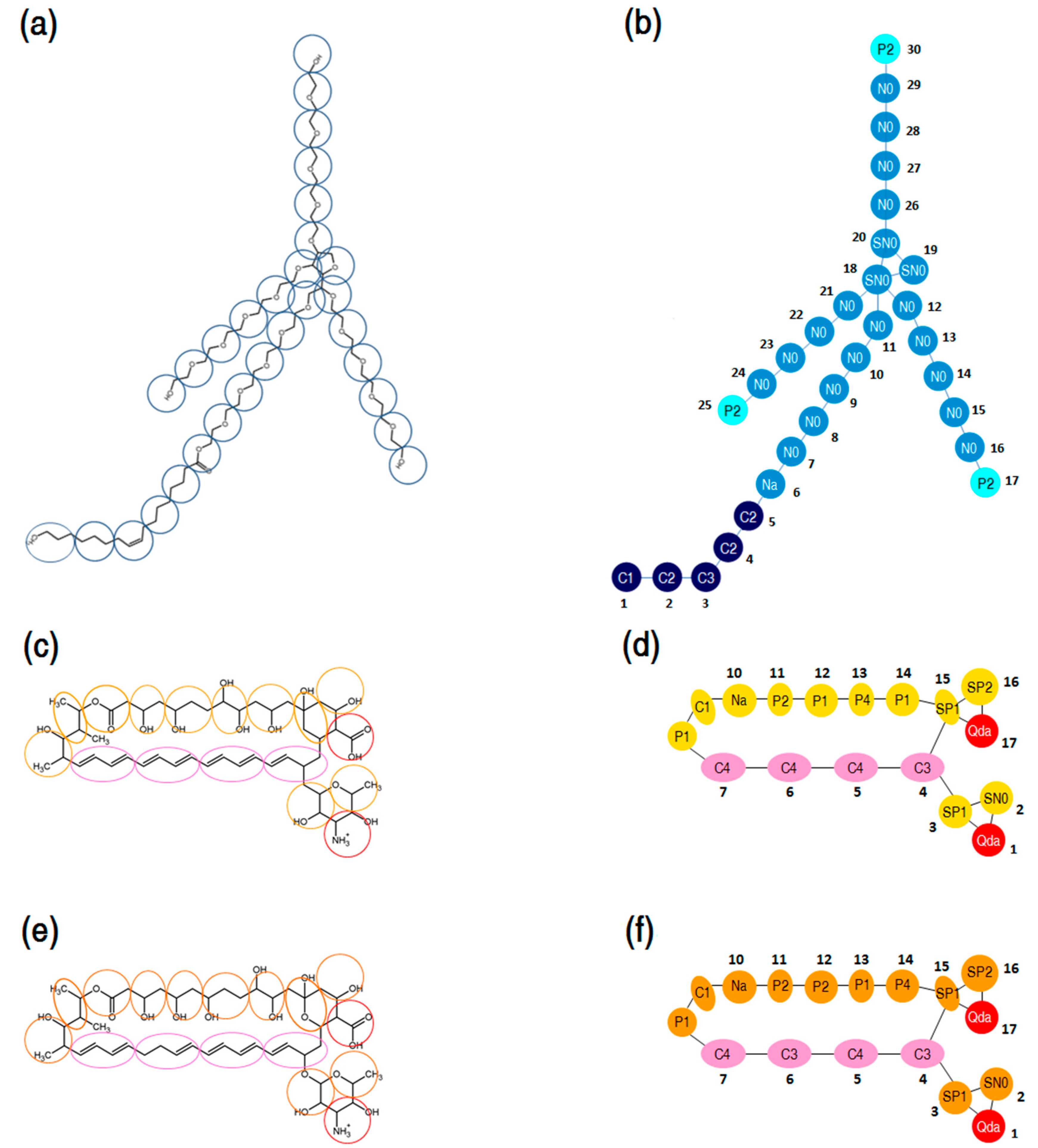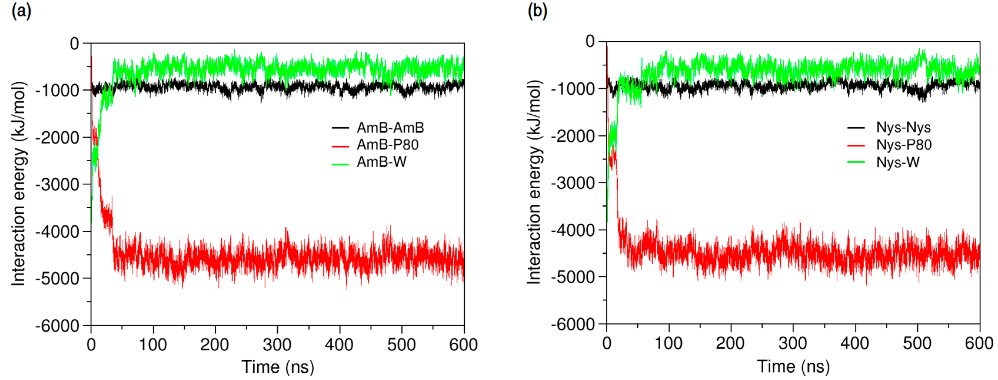 Following our previous work on developing liposomal preparation of AmB [65], in this study, we sought to explore the utility of MD simulation in providing information about the of PA-carrier interactions. Our aim is to gain an understanding of the behavior of PAs in micellar systems and derive potential implications for future formulation developments. We selected Polysorbate 80 (P80) as the model surfactant. P80 is a non-toxic non-ionic detergent widely used for solubilizing and emulsifying hydrophobic pharmaceuticals, cosmetics, and food additives [30,31,32]. The P80 micelles have already been shown to be capable of remarkably enhancing Nys solubility in the aqueous medium [27]. P80 has also been used as a surfactant/co-surfactant in various formulations of AmB, such as microemulsions [33,66], nanoemulsions [67,68], and SEDDS [69,70]. Therefore, the MD simulation study of interactions of PAs with P80 may also provide insight for improving the efficiency of the currently available formulations of these drugs.