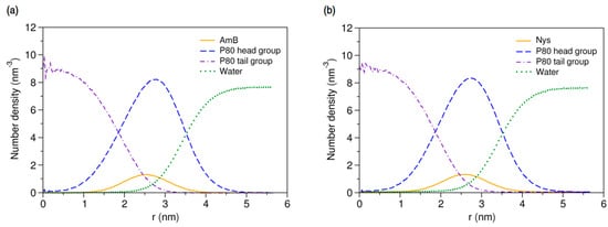 Solubilizing capability of surfactants is largely dependent on their presence in micellar conformation [32,86,87,88,89]. We simulated the interaction of PAs with P80 micelle to explore the solubilization behaviors of these drugs, and properties of the mixed micelles form. Firstly, the interaction of a single PA molecule with a pre-formed equilibrium micelle of 60 P80 molecules (P8060) was simulated (Table 1, Simulations 16 and 28, respectively) in order to characterize the hydration and dynamics of the drug within the micelle. After equilibrium was reached, the presence of PAs in micelles was confirmed by the sharp peak of P80 RDFs against AmB. The RDFs for different molecular groups of P8060-AmB1 and P8060-Nys1 mixed micelles against water are illustrated in Figure 8a,b, respectively.