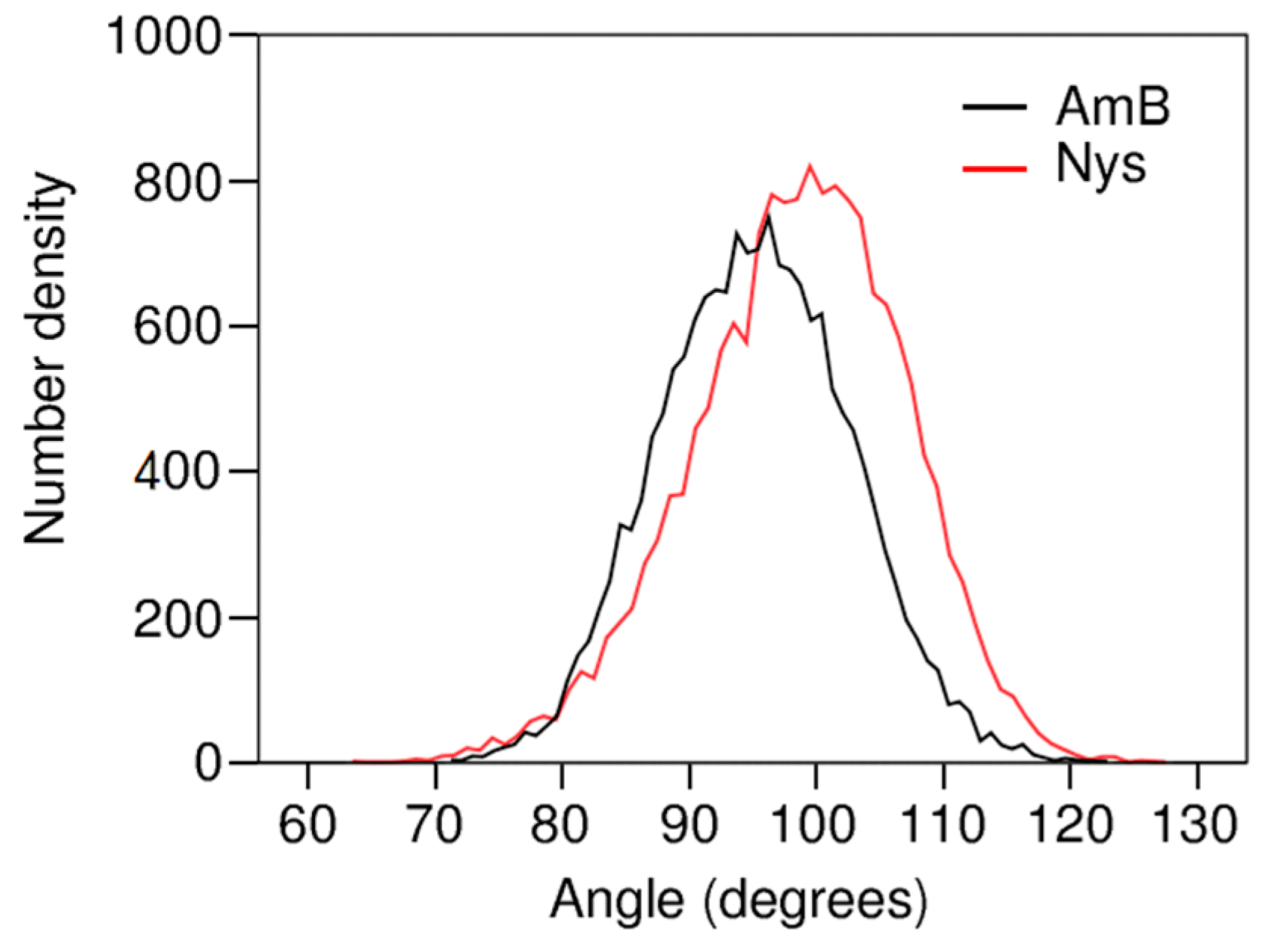 This is confirmed by the progressive decrease of average number of water particles around each PA molecule (Figure 5b) as SASA becomes increasingly limited. The time for evolution of SASA of AmB (Nys) to equilibrium in 10 simulations at various initial configurations ranged from 75 ns (70 ns) to 210 ns (185 ns) and averaged at 127 ± 52 ns (113 ± 44 ns). The pattern of SASA variations indicates the stepwise formation of larger aggregates from the smaller ones, as also observed from the trajectories. The formation of the intermediate and final aggregates proceeds marginally faster for Nys compared with AmB. Although self-aggregation kinetics is sensitive to the initial system setup, considering the identical initial configuration of both AmB-W and Nys-W systems, the slightly faster aggregation of Nys may reflect its observed higher diffusivity.