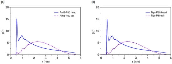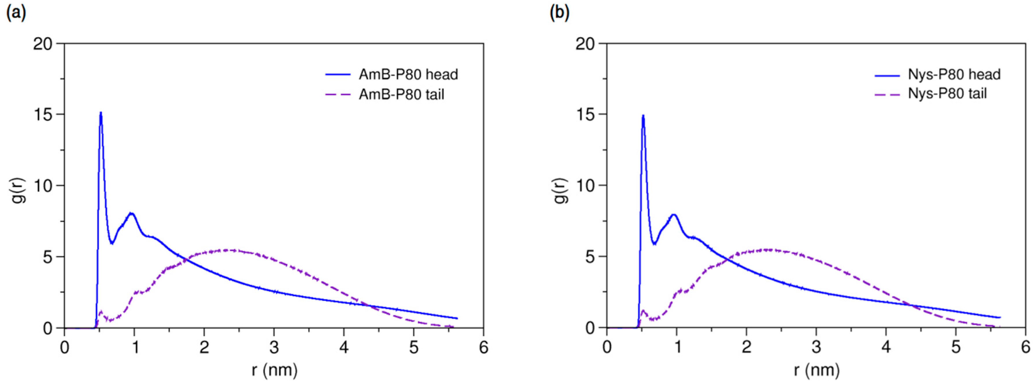 Average radial pair distribution functions for head and tail of P80 against (a) AmB; and (b) Nys in aqueous medium.