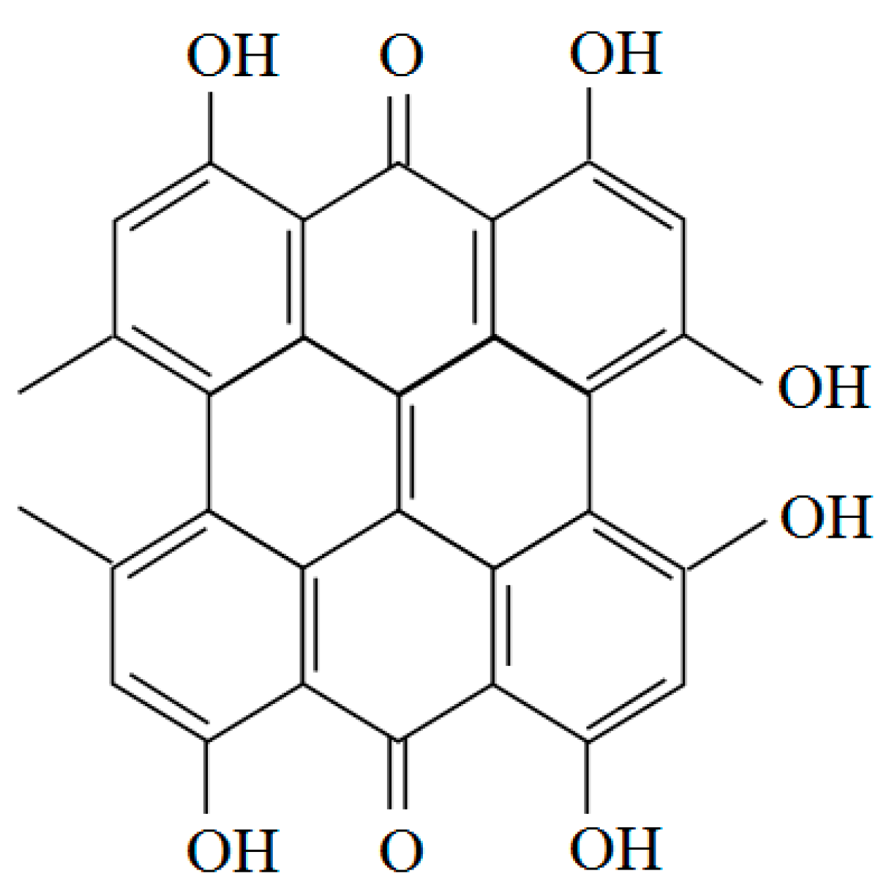 Hypericum perforatum is usually called St. John’s Wort. The extract of Hypericum perforatum (HPE) is widely used for the treatment of affective disorders [100]. It could reduce voluntary alcohol intake in Marchigian Sardinian alcohol-preferring (msP) rats and act synergistically with opioid receptor antagonists to further reduce alcohol consumption. The effect on alcohol intake of the combined treatment remained stable during the 12 days of chronic treatment. The food intake was slightly reduced, while no change on body weight, was observed compared with the control. The whole treatment was without development of tolerance [101]. HPE (50 and 100 mg/kg) produced positive inhibitory effects on tremor and audiogenic seizures during the withdrawal period in alcohol-preferring rats. These results suggest that HPE could have some beneficial effects on alcohol withdrawal syndrome in people [102]. Hypericum perforatum exhibits remarkable antioxidant potential due to high content of phenolic compounds, especially flavonoids, hyperforin and hypericin [103]. Hyperforin has NMDA-receptor-antagonistic and potential neuroprotective effects in vitro which might provide therapeutic effectiveness in the relapse prevention of alcohol use disorders [103]. In addition, hyperforin could reduce alcohol intake more effectively than hypericin in alcohol-dependent mice [104]. The CO2 extract of hypericum has been also shown to mediate alcohol intake in msP rats. Animal tests verified that the CO2 extract with 24.33% hyperforin and a very low content of hypericin inhibited alcohol intake more potently than the alcoholic extract containing 0.3% hypericin and 3.8% hyperforin. Hyperforin might thus play an important role in reducing alcohol intake. Neurochemical mechanisms are responsible for the reduction of alcohol intake and the antidepressant-like effect of HPE [105]. Hypericum perforatum markedly reduced alcohol intake in msP rats, and its effect was behaviorally selective. In other studies, the GABAA receptor antagonist bicuculline and the GABAB receptor antagonists CGP-36742 did not modify the effect of CO2 extract of hypericum. These results indicated that the inhibitory effects of HPE on alcohol intake are not mediated by GABA agonist actions [106,107]. In conclusion, Hypericum perforatum might be effective to improving alcohol drinking behaviors, although more efforts are needed to clarify the specific mechanisms. The molecular structure of hypericin is shown in Figure 2.