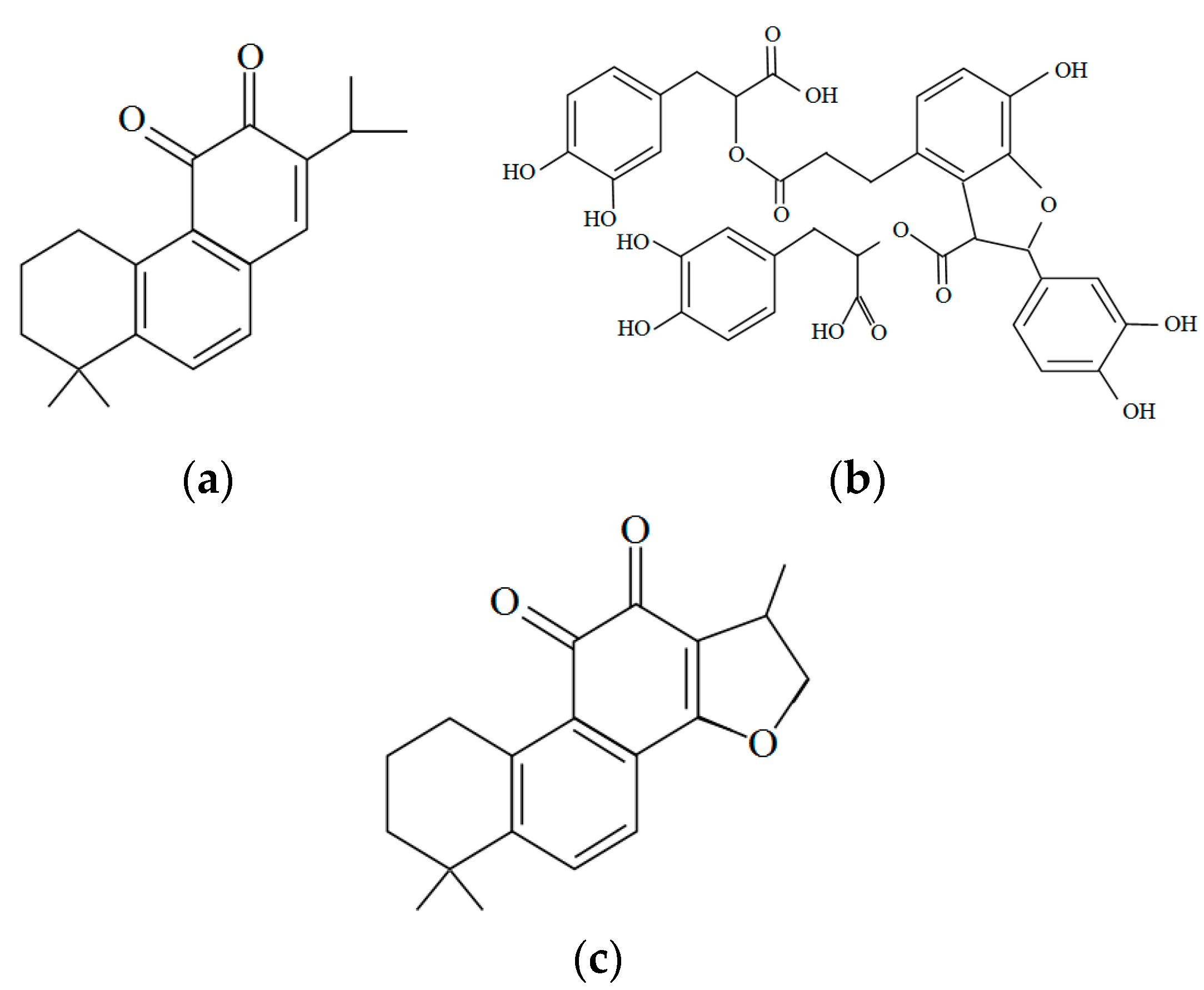 Structures of several bioactive components in Salvia miltiorrhiza: (a) Miltirone; (b) Salvianolic acid B; (c) Cryptotanshinone.