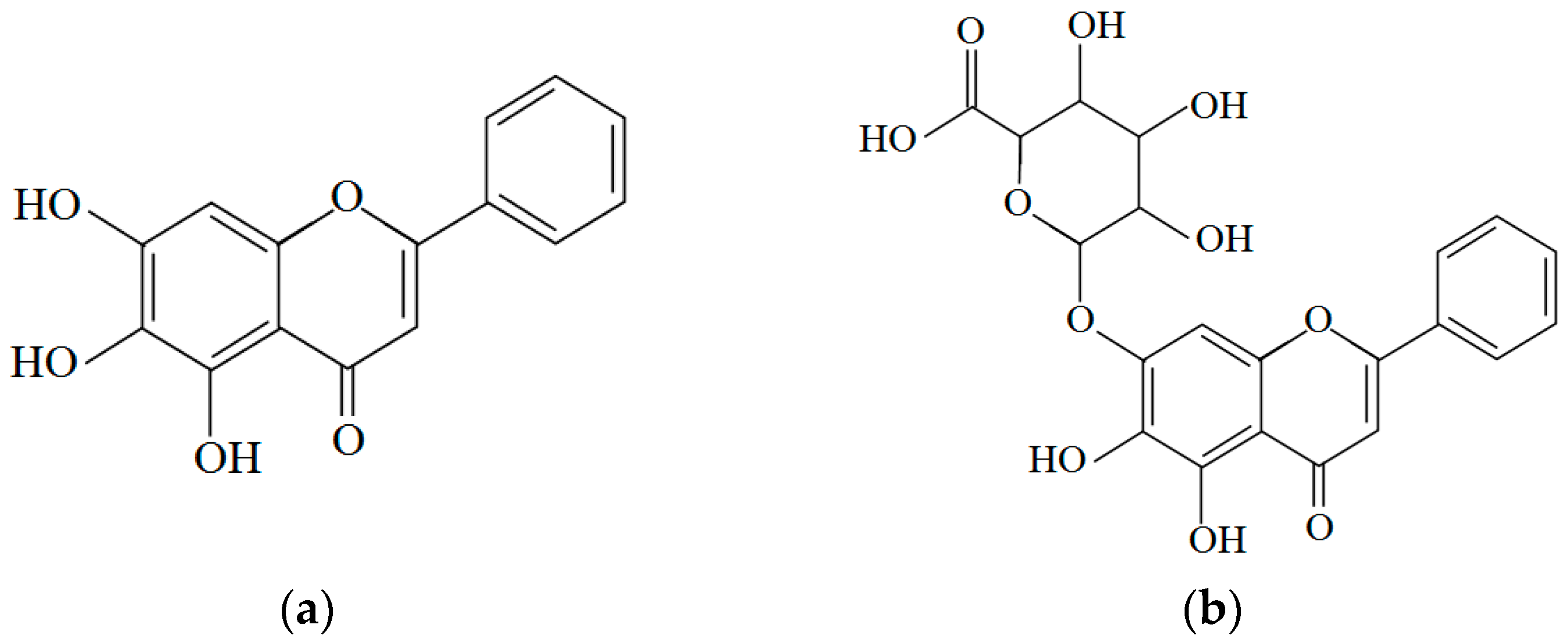 Structures of two bioactive components in Scutellaria baicalensis: (a) Baicalein; (b) Baicalin.