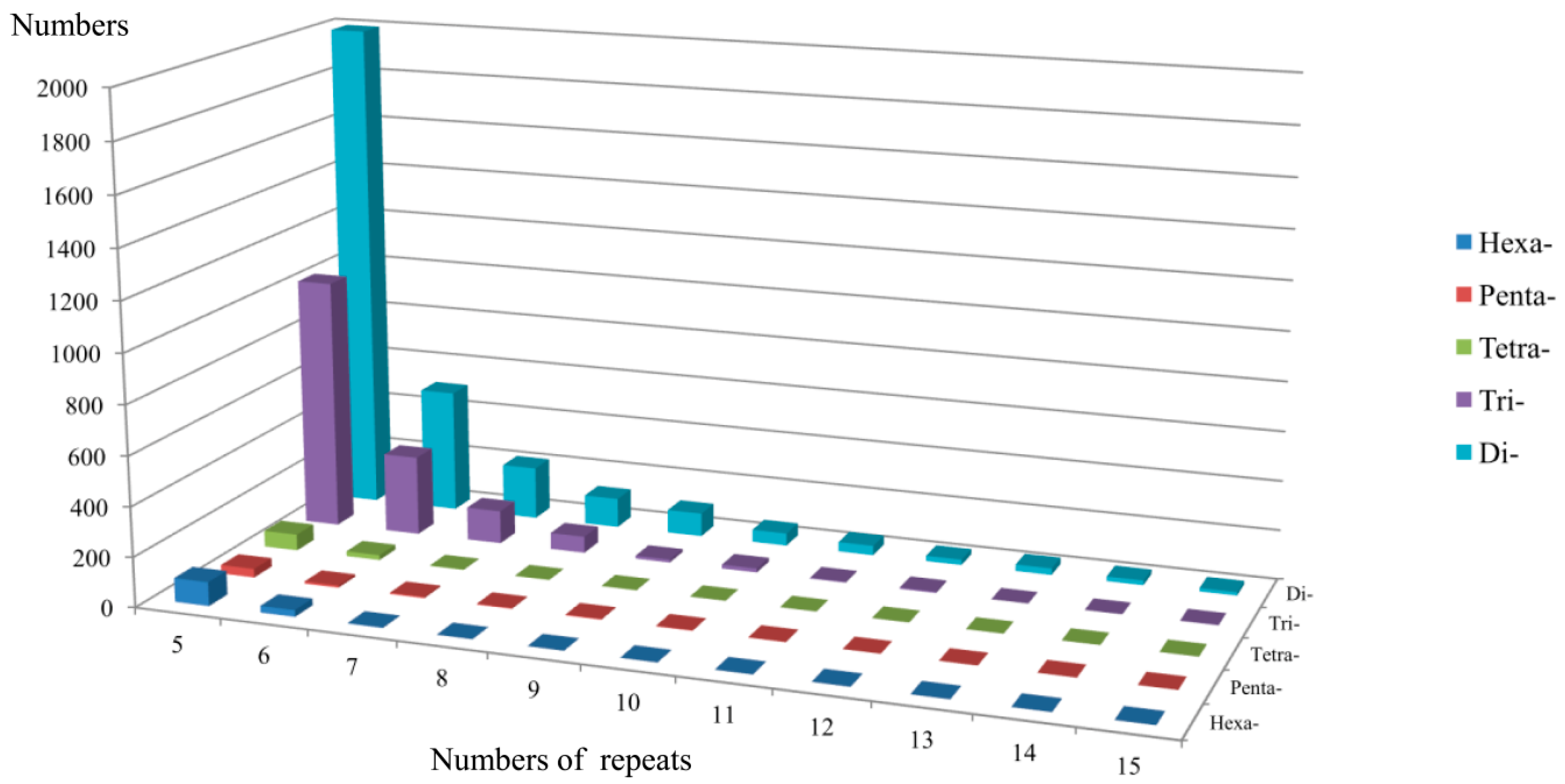 2.1. Frequency Distribution of Various SSRs in the Transcriptome
