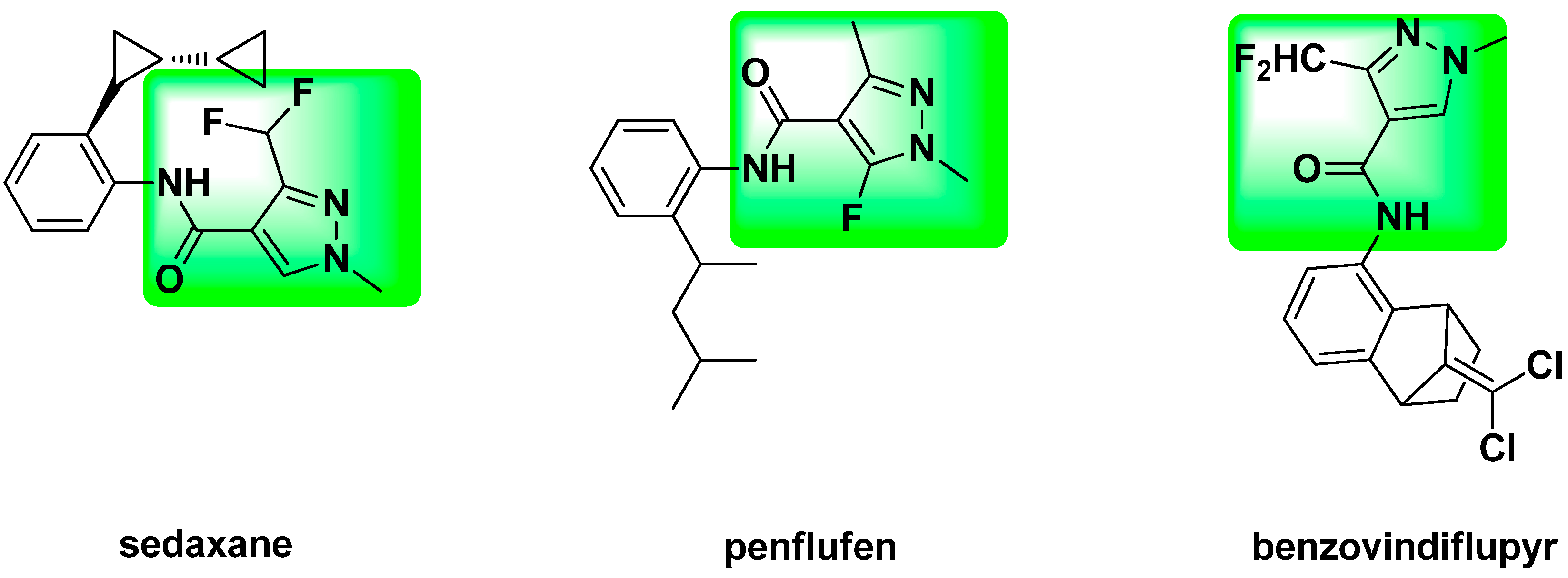 Heterocyclic structures are important key features in natural products or synthetic medicines and pesticides because of their high-efficiency, low toxicity and diversity of possible substituents [1,2,3,4,5]. This has become a hot research topic in the medicine and pesticides field. Pyrazole is an important kind of heterocyclic nitrogen compound [6,7,8], which derivatives exhibit a wide range of biological activities, such as antifungal [9], insecticidal [10], herbicidal [11], anticancer [12], anti-inflammatory [13] and so on. So far, many pyrazole derivatives such as the insecticides tebufenpyrad and chlorantraniliprole, the fungicides penthiopyrad and pyraclostrobin, and the medicine antipyrine, etc., have been successfully developed by different companies. On the other hand, heterocycles with amide groups are reported as a class of compounds displaying extensive biological activities, such as anti-biofilm [14], herbicidal [15,16], anticancer [17], antifungal [18], antiproliferative [19], plant growth regulation [20] and so on. They represent an important class of natural and synthetic products and extremely versatile building blocks for the manufacture of bioactive compounds in pharmaceutical drug design and the agrochemical industry. In recent years, many succinate-dehydrogenase-inhibitor (SDHI) fungicides had been introduced into the market for effective treatment of fruit and vegetable crops, such as sedaxane, penflufen and benzovindiflupyr (Figure 1). Penflufen is one of the members in this new class of fungicides for the treatment of a wide range of diseases. From Figure 1, the structure of penflufen contains a phenyl ring, an amide group and a 1,3-dimethyl-5-fluoropyrazole moiety.