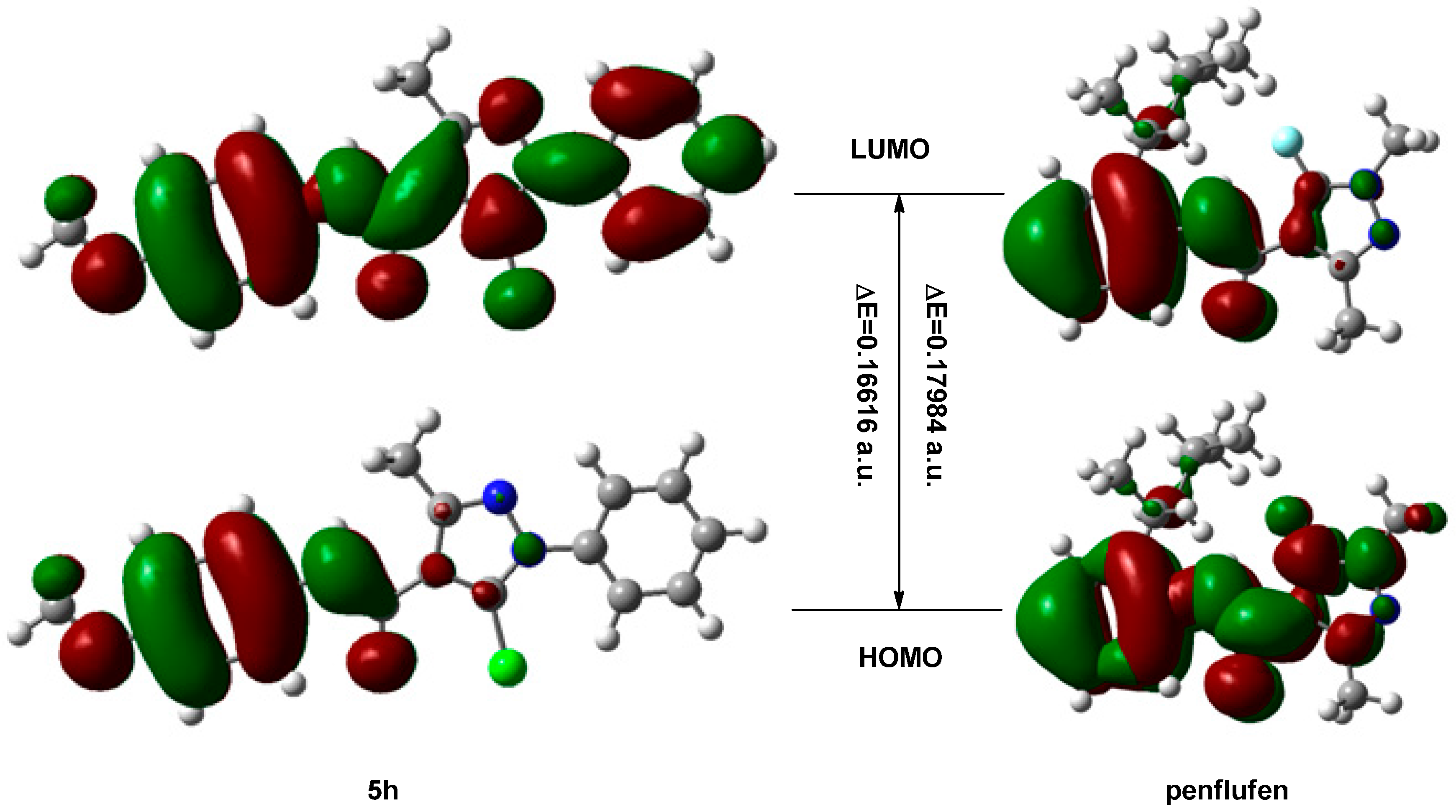The total molecular energy and frontier orbital energy levels of compound 5h and penflufen are listed in Table 2. Energy gap between HOMO and LUMO was calculated by B3LYP.