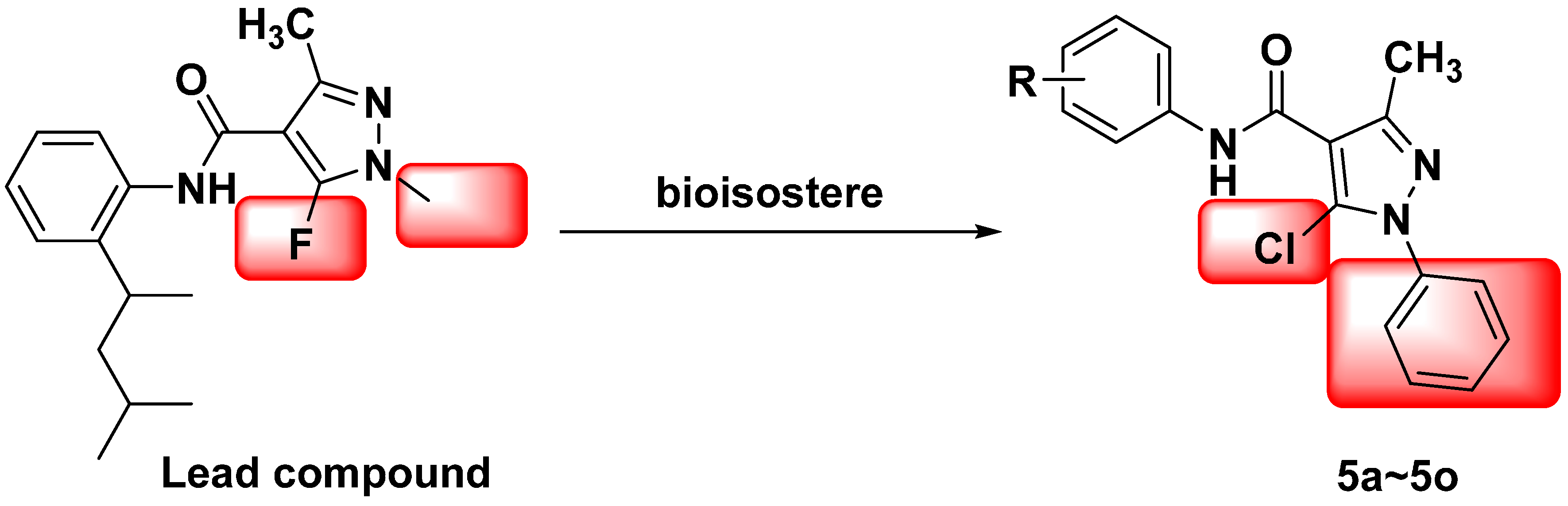 In our previous work, some amide derivatives exhibited excellent herbicidal [21] and fungicidal activity [22]. In line with our continued efforts to synthesize bioactive lead compounds for crop protection [23,24,25,26,27,28,29], the title amide compounds had modified N-substituted pyrazole pharmacophore scaffolds. It is reported that the halogens exhibit similar biological effects. Meanwhile, the aromatic ring also held diverse functions. In order to discover highly active pyrazole amide compounds, the commercial amide fungicide penflufen was selected as a lead compound, and the 1-methyl and 5-fluoro groups on the pyrazole ring were replaced by a phenyl ring and chloro group, respectively. Our original strategy is depicted in Scheme 1. It is possible that pyrazole amide derivatives possess antifungal activities.