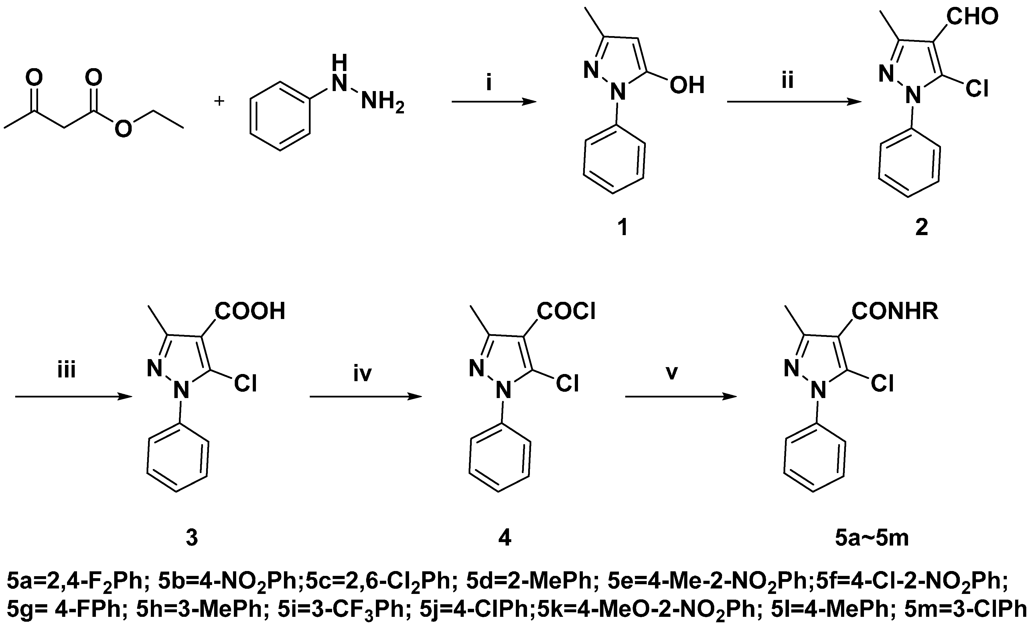In the present paper, a series of pyrazole amide analogues were designed by replacing methyl group and fluorine of penflufen with phenyl and chlorine. First, the pyrazole ring was synthesized from phenylhydrazine and ethyl acetoacetate as starting materials using a classical Knorr reaction, then, using the universal Vilsmeier-Haack reaction, apyrazole with an aldehyde group was obtained in excellent yield. The COOH group can be prepared easily through oxidation with KMnO4. The target compounds were prepared according our previous work [30]. When 5-chloro-3-methyl-1-phenyl-1H-pyrazole-4-carbonyl chloride was reacted with a substituted amine, organic base Et3N was used instead of the inorganic base K2CO3, while the temperature must be maintained at 0–5 °C, as higher temperatures decreased the yield of product. The imide or lactam product will be obtained.