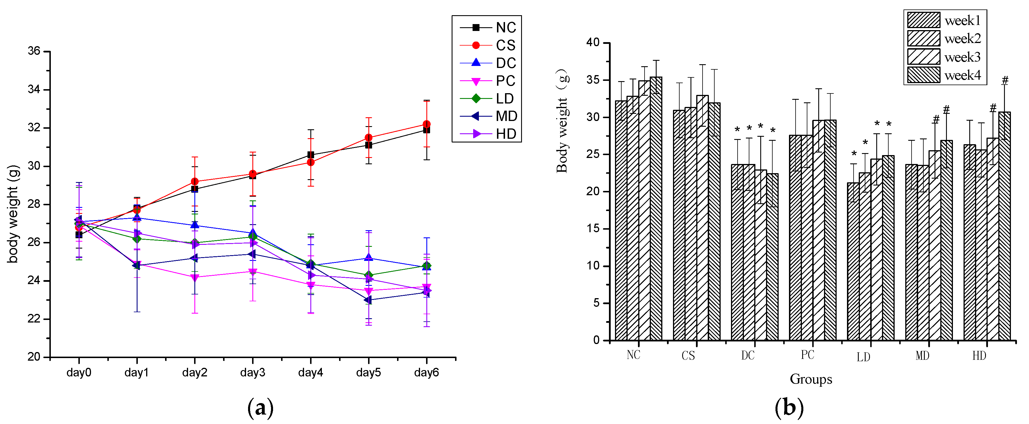 Figure 1. (a) Body weight of normal and STZ-induced diabetic mice in first 6 days after the STZ treatment; (b) Body weight of normal and STZ-induced diabetic mice in four weeks. Results were presented as means ± SD (n = 10). The columns of each index in have * p < 0.05, vs. NC; # p < 0.05, vs. week 1. NC, CS, DC, PC, LD, MD and HD are abbreviations for non-diabetic control group, non-diabetic CSFs high dose group, diabetic control group, diabetic CSFs low dose group, diabetic CSFs medium dose group, and diabetic CSFs high dose group, respectively.