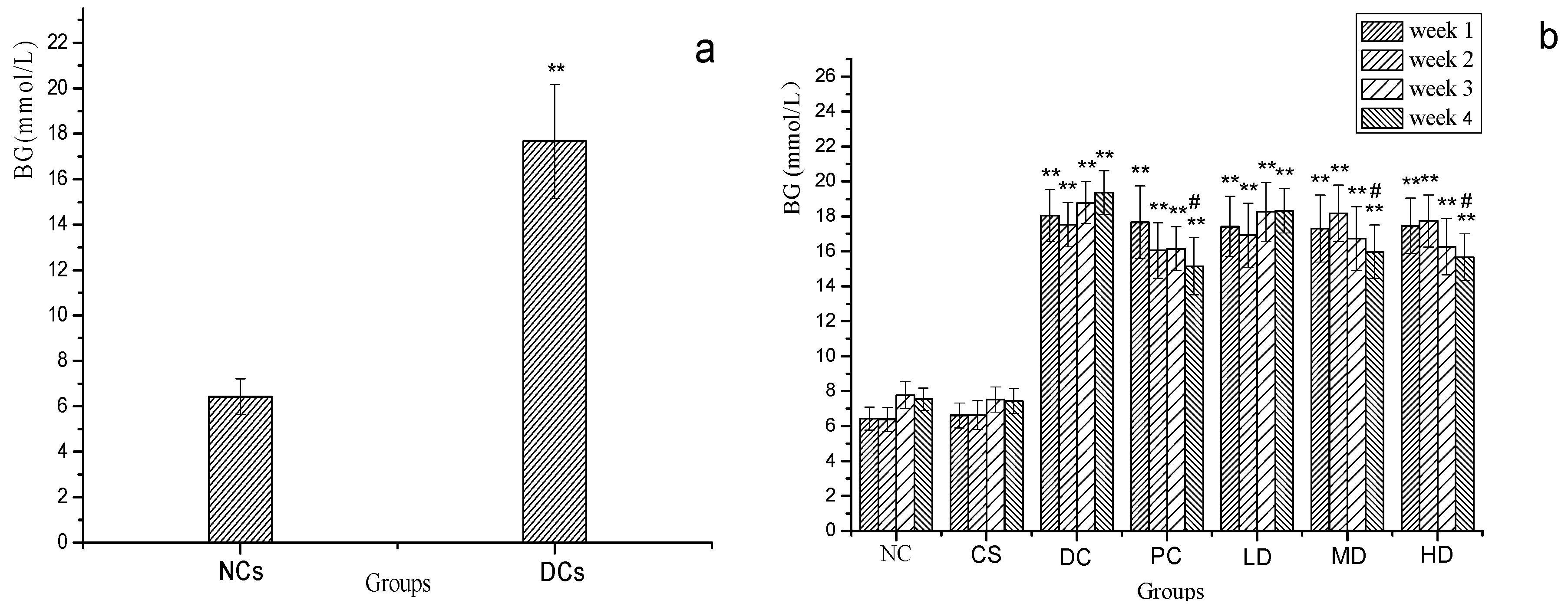 Figure 2. (a) Fasted BG levels of NCs [normal mice] and DCs [streptozotocin-induced diabetic mice] on the sixth day; (b) Fasted BG levels of NC, CS, DC, PC, LD, MD and HD in four weeks. Results were presented as means ± SD (n = 10). The columns of each index in Figure 2a have ** p < 0.01 vs. NCs. The columns of each index in Figure 2b have ** p < 0.01 vs. NC; # p < 0.05 vs. week1. Group abreviations are as given in the caption of Figure 1.