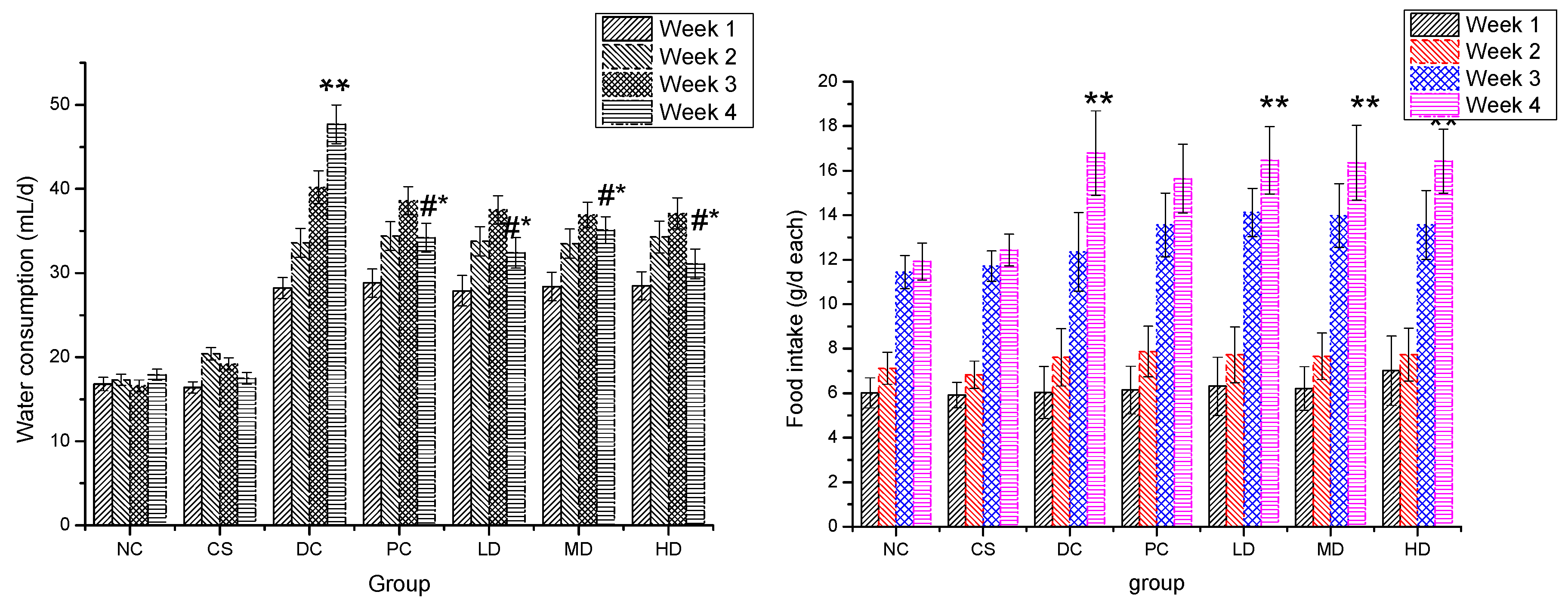 Figure 3. Water consumption (a) and food intake (b) of normal and STZ-induced diabetic mice. Results are presented as means ± SD (n = 10). The columns of each index have * p < 0.05, ** p < 0.01 vs. NC; # p < 0.05 vs. week 1. Group abbreviations are as given in the caption of Figure 1.