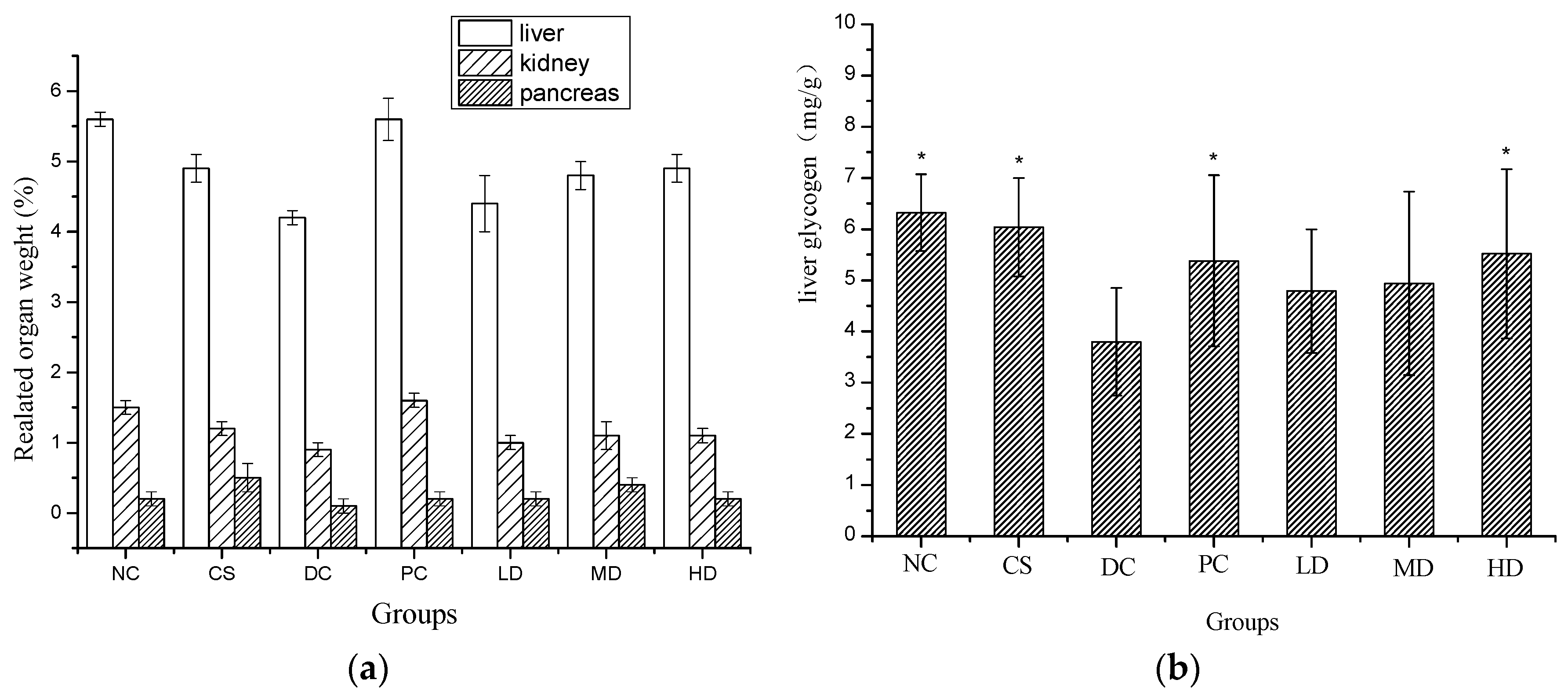 Figure 4. Related organ weight (a) and liver glycogen (b) of normal and STZ induced diabetic mice. Results were presented as means ± SD (n = 10). The columns of each index have * p < 0.05 vs. NC; Relative liver weight (%) = absolute kidney weight (g)/final body weight (g); relative kidney weight (%) = absolute kidney weight (g)/final body weight (g); relative pancreas weight (%) = absolute pancreas weight (g)/final body weight (g). Group abbreviations are as given in the caption of Figure 1.