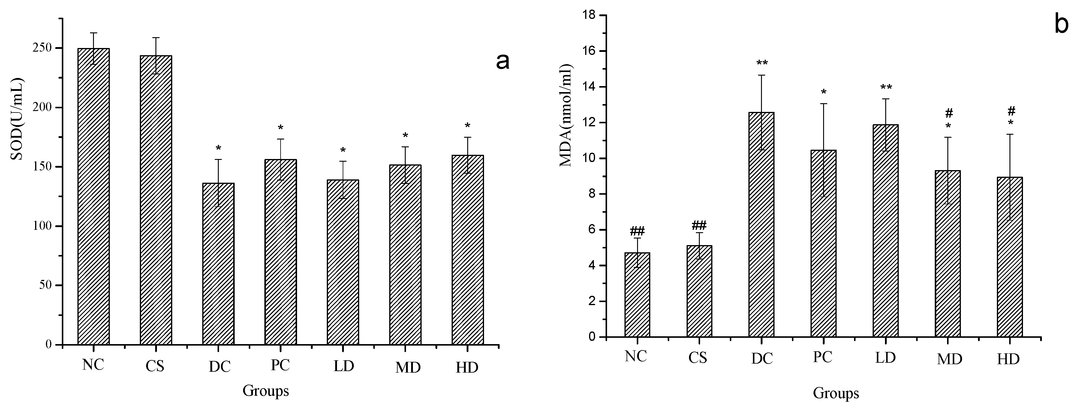 Figure 5. SOD (a) and MDA (b) of normal and STZ induced diabetic mice. Results were presented as means ± SD (n = 10). The columns of each index have * p < 0.05, ** p < 0.01 vs. NC; # p < 0.05, ## p < 0.01 vs. DC. Group abbreviations are as given in the caption of Figure 1.