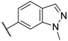 While exploring the effects of R1 substitutions on binding affinity in the screening campaign of compounds 13a–17 in Table 1, we noticed that the A-ring is essential because the substitution of hydrogen as seen in compound 15a, dramatically reduces ERRγ binding affinity. The presence of an alcohol para to the phenyl ring also poses a negative effect on binding affinity as seen in compound 15b. Although introduction of a substituted heterocyclic system (compounds 15c–f) led to a significant loss of affinity, while among the bicyclic system-adopted compounds 15g–j, an analog with the Me-indazole group (compound 15g) displayed decent binding affinity.