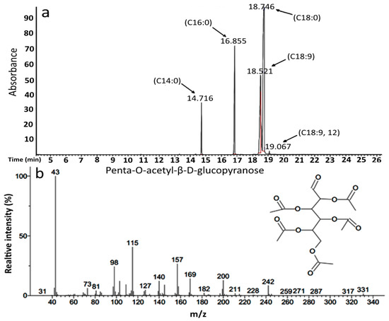 GC-MS analysis shows that a major part of the antimicrobial glycolipid produced by the bacterium is probably related to a glucose-derived sugar linked to a fatty acid moiety such as octadecanoic acid and 9-octadecenoic acid, while the remaining compounds comprise four derivative analogues with the only difference in their fatty acid moieties (Table 2). The GC chromatogram and the corresponding mass spectrum for each compound are presented in Figure 1a,b.