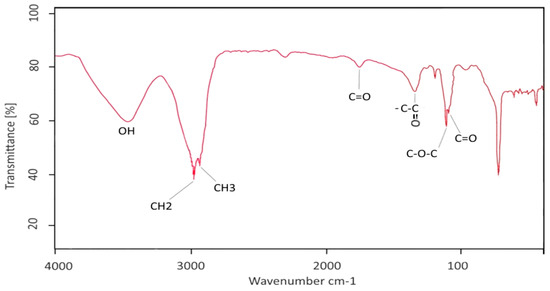 FT-IR spectrum displays a broad peak at 3435.42 cm−1 elucidating OH group (Figure 2). Two stretch signals at 2940.29 and 2877.33 could be associated with CH2 and CH3 in the hydrocarbon chain. A lowered peak at 1769.34 cm−1 proves the presence of a carbonyl group (C=O) conjugated with sugar as well as a deformed signal at 1374.82 affected by the carboxyl group. Additionally, three stretch signals appeared at 1213.84, 1121.24 and 1118.04 cm−1 where the former indicates a C–O–C bond and the two latter confirm the presence of C=O in the glycolipid structure [14]. The region between 700 and 950 cm−1 is considered a carbohydrate fingerprint and often presents some peaks related to anomeric carbon [15].