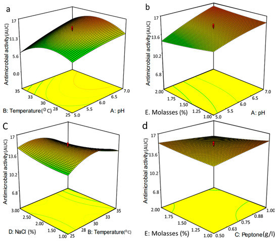 The fitted three dimensional plots show the effects of the independent factors with significant interactions with the variable pairs (Figure 3). The shape of these plots could be helpful to understand the model and the status of interaction between the independent variables. The optimum predicted responses are shown at highlighted points based on interactive effects between each pair of independent factors. As per the model, the maximum predicted response for antimicrobial activity could be estimated at 17.26 at the desirable conditions, including pH 7, temperature 33 °C, peptone 1%, NaCl 1% and molasses 1% (w/v).