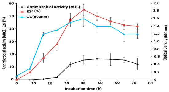 The experiment was conducted according to the predicted parameters of RSM for optimum antimicrobial activity. The antimicrobial and emulsification (E24) activities accord with bacterial growth (OD 600), which increased up to 42 h post-incubation (Figure 4). The antimicrobial activity remained constant during the following hours of the incubation, while emulsification activity decreased along with bacterial growth. Moreover, the antimicrobial activity reached around the predicted response, denoting the reliability of RSM prediction. The time course study shows a maximum inhibitory effect around 15.5 AUDC, meaning that it presents a significant correlation with the predicted value (AUDC 17.5) calculated by the RSM statistical algorithm. Besides, this difference between the RSM predicted and time course responses may be due to unknown and unpredictable conditions.