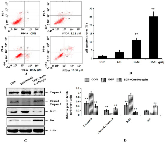 2.4. Cordycepin Induces Apoptosis and Regulates Apoptosis-Related Proteins Bcl-2 and Caspase-3 in H1975 Cells