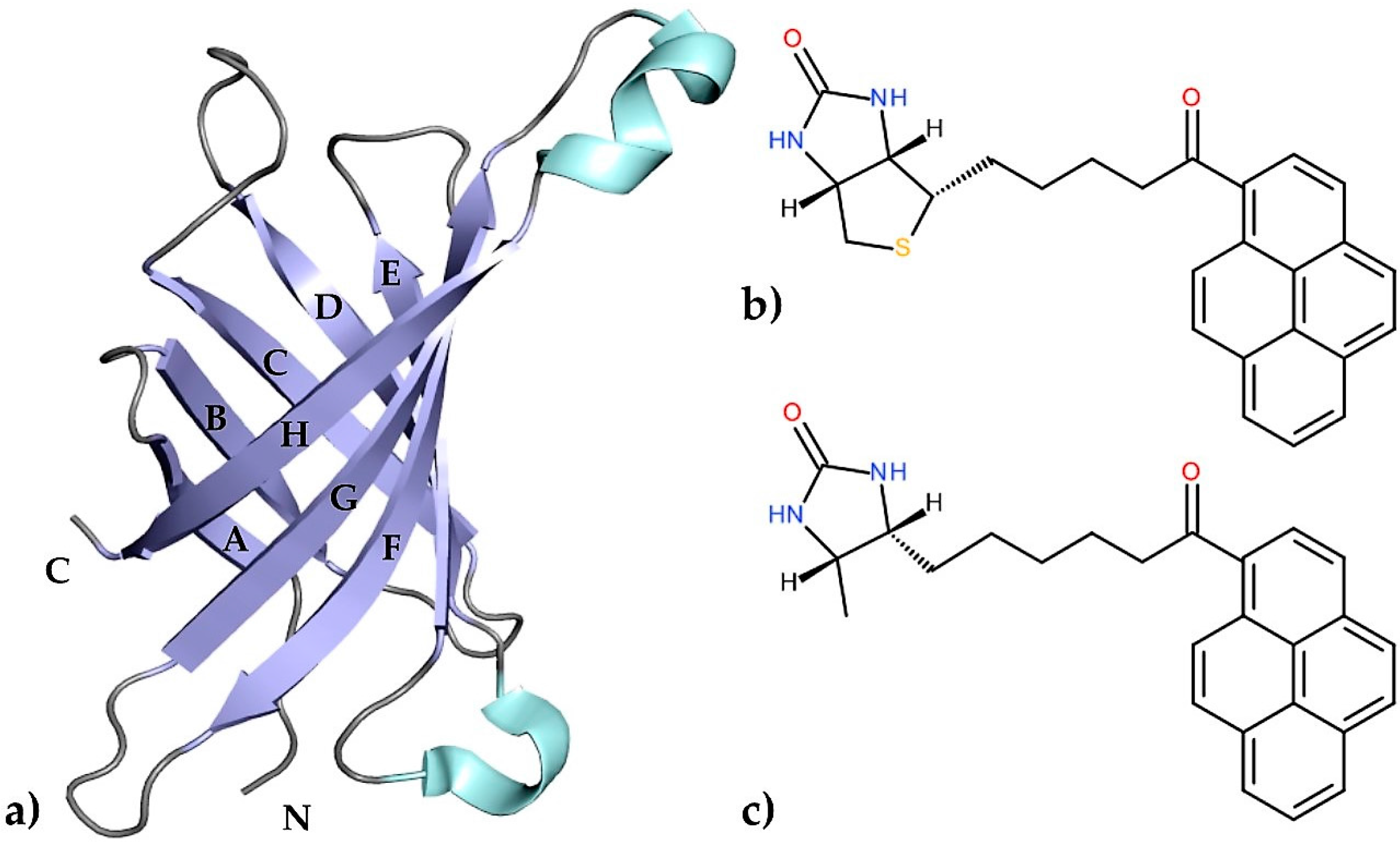 (a) An illustrated representation of the topology of avidin. The central eight-stranded antiparallel β-sheet, α-helixes, and loops are colored blue, cyan, and grey, respectively; (b) A schematic diagram of 1-biotinylpyrene (B9P) and (c) 1-desthiobiotinylpyrene (D9P).