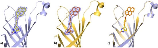In both determined structures of the avidin complexes, the calculated electron-density maps were clear and allowed tracing of almost all residues of the protein. Chain C from the avidin/B9P complex, which has a relatively similar topology to chain C from the avidin/D9P (PDB code 5IRW), was selected for structural descriptions of protein molecule. The pyrene derivative in this monomer was exceptionally well defined in difference electron-density maps and could be modeled without any ambiguity (Figure 2a).