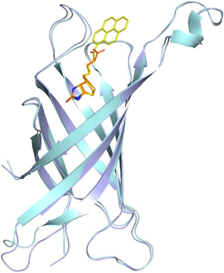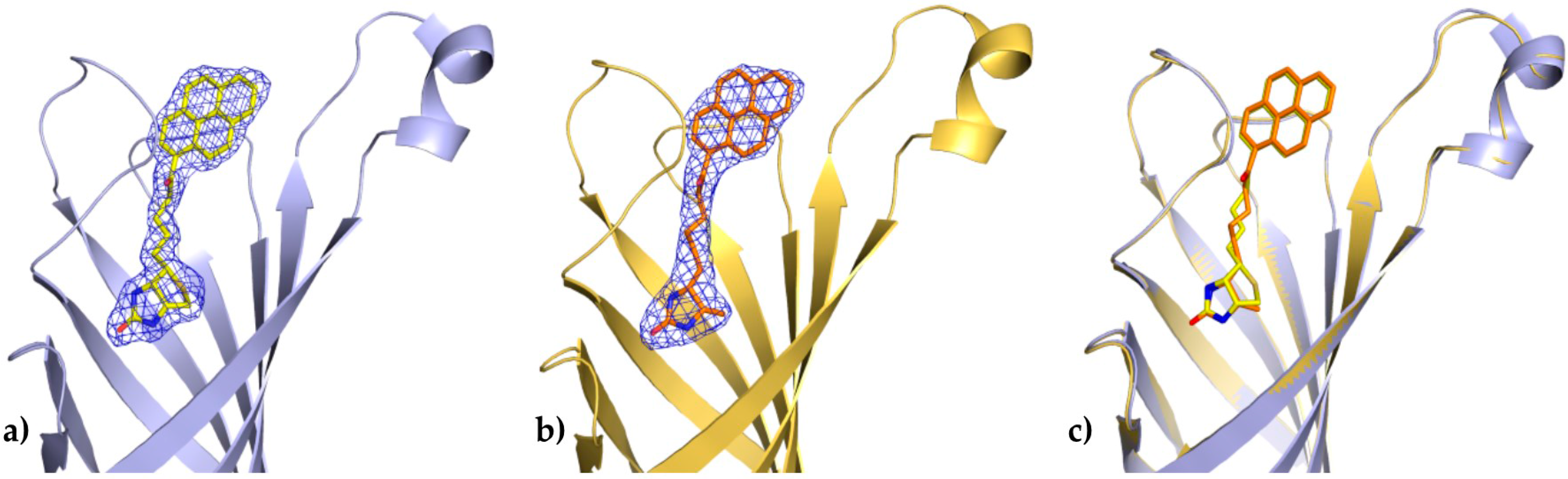 In the present work, we have determined the first crystal structures of the avidin complexes with two fluorescent pyrene-biotin conjugates: 1-biotinylpyrene (B9P) and 1-desthiobiotinylpyrene (D9P), which were obtained via a Friedel–Crafts acylation of pyrene with biotin or desthiobiotin, respectively (Figure 1b,c). Recent studies have shown that this acylation is one of the effective C–C bond formation reactions between biotin and an aromatic system such as pyrene; moreover, such conjugates display high affinity to avidin [19]. Our structural studies reveal that the aromatic biotinylated ketones formed in this reaction may find applications in various biochemical procedures based on the biotin–avidin system, especially as fluorescent probes to visualize biochemical processes.