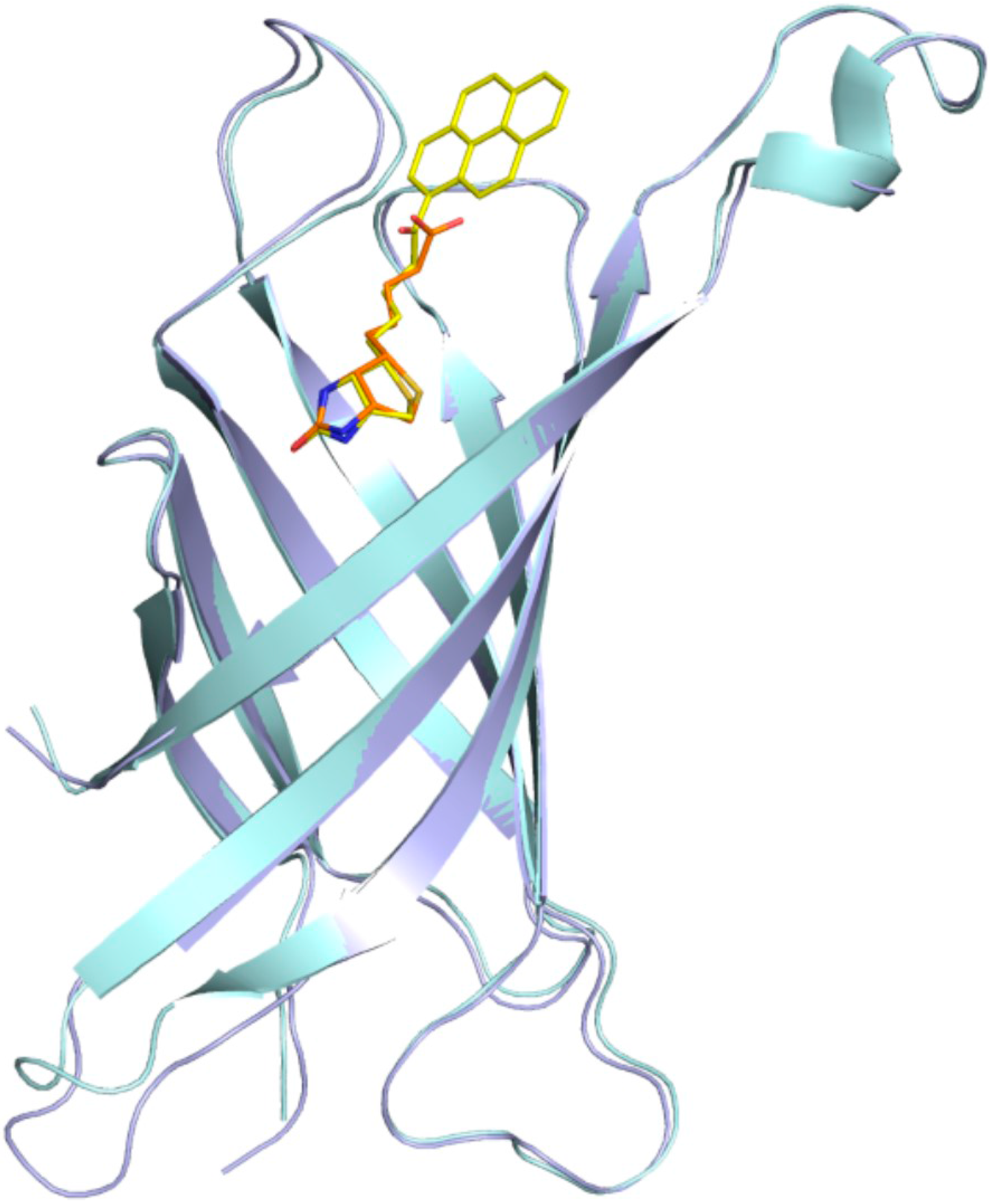 Superposition of the avidin–biotin structure (cyan/orange) with the avidin/B9P structure (light blue/yellow). The structures were superimposed on corresponding Cα atoms.
