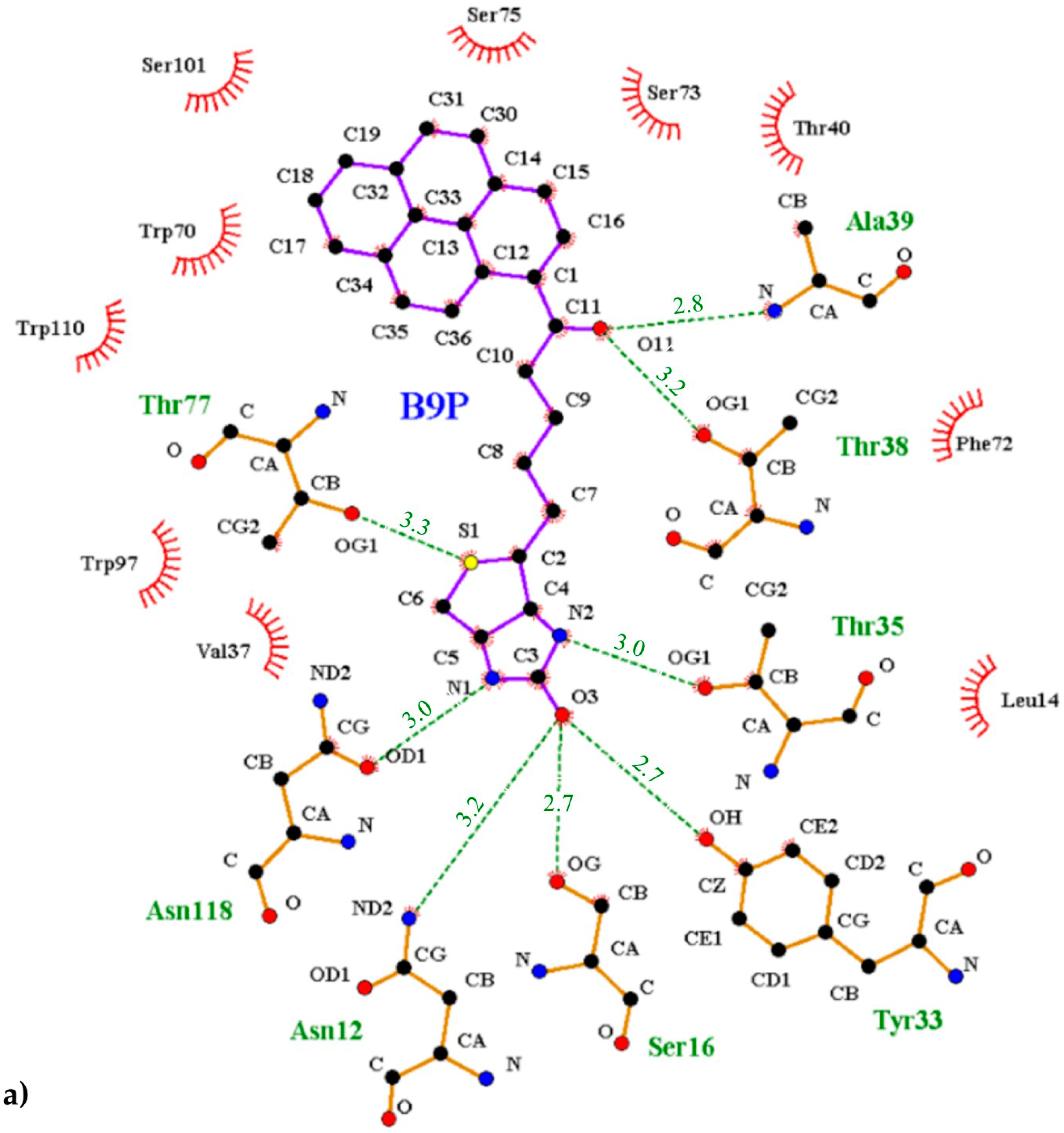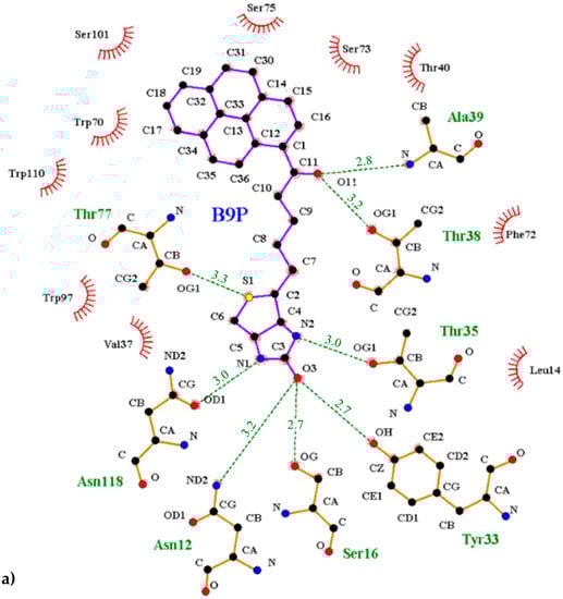 - Wallace, A.C.; Laskowski, R.A.; Thornton, J.M. LIGPLOT: A program to generate schematic diagrams of protein-ligand interactions. Protein Eng. 1995, 8, 127–134. [Google Scholar] [CrossRef] [PubMed]