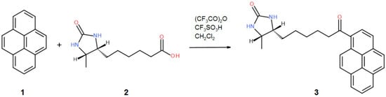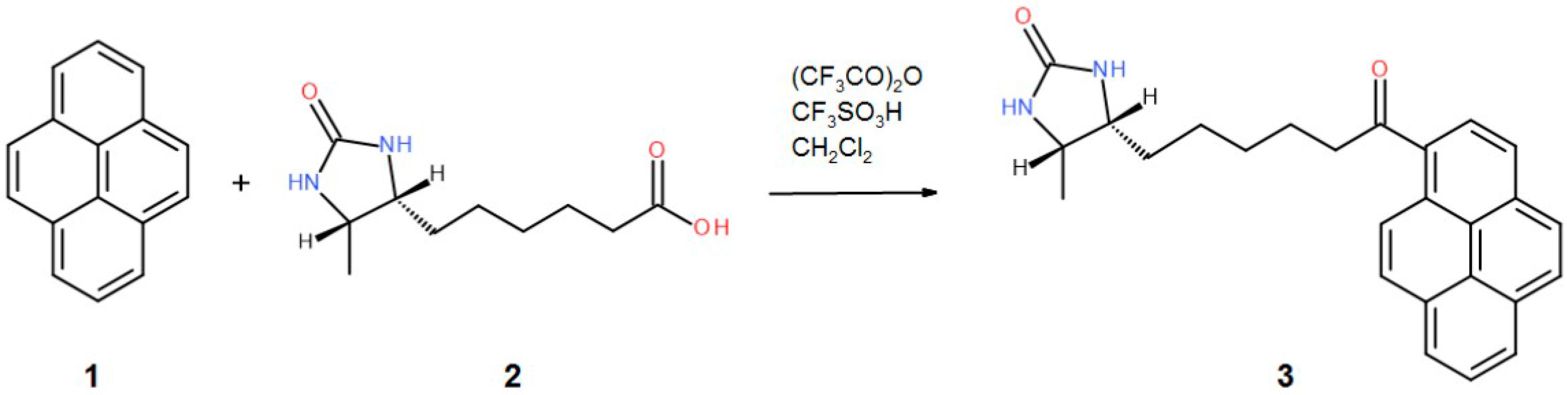An amount of 227 mg (150 µL, 1.08 mmol) of the trifluoroacetic anhydride was added to a solution of 214 mg (1.0 mmol) of d-desthiobiotin 2. After 1 min of stirring at RT, 202 mg (1.0 mmol) of pyrene 1 was added, followed by an addition of 88 µL (1.0 mmol) of trifluoromethanesulfonic acid. After 2 h of stirring at RT, the reaction mixture was quenched by an addition of 10 mL of sodium bicarbonate, and the product was extracted with dichloromethane. The organic layer was washed with brine, dried over magnesium sulfate, and evaporated. Chromatography on silica gel using DCM-Methanol 95-5 gave pure 3 in a 41% yield (163 mg)—Figure 6.