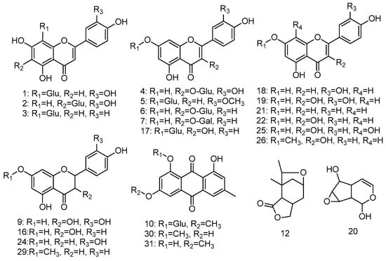 The chemical structures present in R. davurica. The peak numbers in this figure correspond to those used in Table 1.