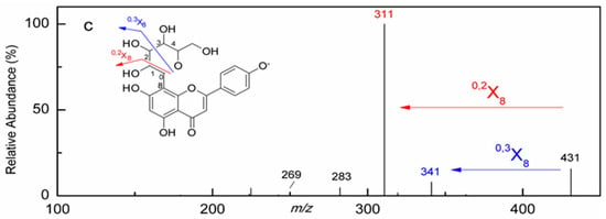 As for C-glycosides from R. davurica, the MS/MS spectra and proposed fragmentation pathways are shown in Figure 3. Specifically, fragments [M − H − 60]−, [M − H − 90]− and [M − H − 120]− are the characteristic diagnostic ions of glycone []. Peaks 1 and 2 showed the same [M − H]− ion at m/z 447 and MS/MS spectra at m/z 357, 327, 297 and 285, implying that they were structural isomers. Fragment ions at m/z 357 and 327 were due to the collision-induced dissociation (CID) of glycone at the 0−3 bond (0,3X, 90 Da) and the 0−2 bond (0,2X, 120 Da). Taken into consideration both the deprotonated molecular ions at m/z 447 and the aglycone ion at m/z 285 ([M − H − 162]−, loss of a hexose moiety), they were tentatively characterized as luteolin monohexoside. For Peak 1 (Figure 3b), the diagnostic ion of base peak for C-8-hexosides of [M − H − 90]− at m/z 357 (0,3X8) was more abundant than that of [M − H − 120]− at m/z 327 (0,2X8). However, for Peak 2 (Figure 3a), the base peak of [M − H − 120]− at m/z 327, characteristic of C-6-hexosides (0,2X6), was of higher abundance than that of [M − H − 90]− at m/z 357 (0,3X6). Hence, Peaks 1 and 2 were identified as orientin (calculated for C21H20O11, m/z 448, luteolin 8-C-glucopyranoside) and isoorientin (luteolin 6-C-glucopyranoside) [], both of which were found in R. davurica for the first time in this study. As expected, our results were in accordance with the previous studies showing that C-8-glycoside eluted before its C-6-isomer [,]. Similarly, Peak 3 (Figure 3c) exhibited the [M − H]− ion at m/z 431 and the aglycone ion at m/z 283 ([M − H − 162]−, loss of a hexose moiety). With the higher abundant peak of [M − H − 90]− at m/z 341, characteristic of C-8-hexosides (0,2X8), and further MS/MS ions at m/z 283 and 269, Peak 3 was thus identified as vitexin (calculated for C21H20O10, 432 Da, apigenin 8-C-glucopyranoside) []. Finally, Peaks 1, 2 and 3 were further validated by comparing their LC-MS/MS with the corresponding standards.