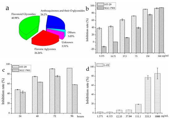 The percentage compositions of different component groups (a) from R. davurica and its dose-dependent (b) and time-dependent (c) antiproliferative activities against HT-29 and SGC-7901 cells and its general toxicity on L-O2 cells (d).