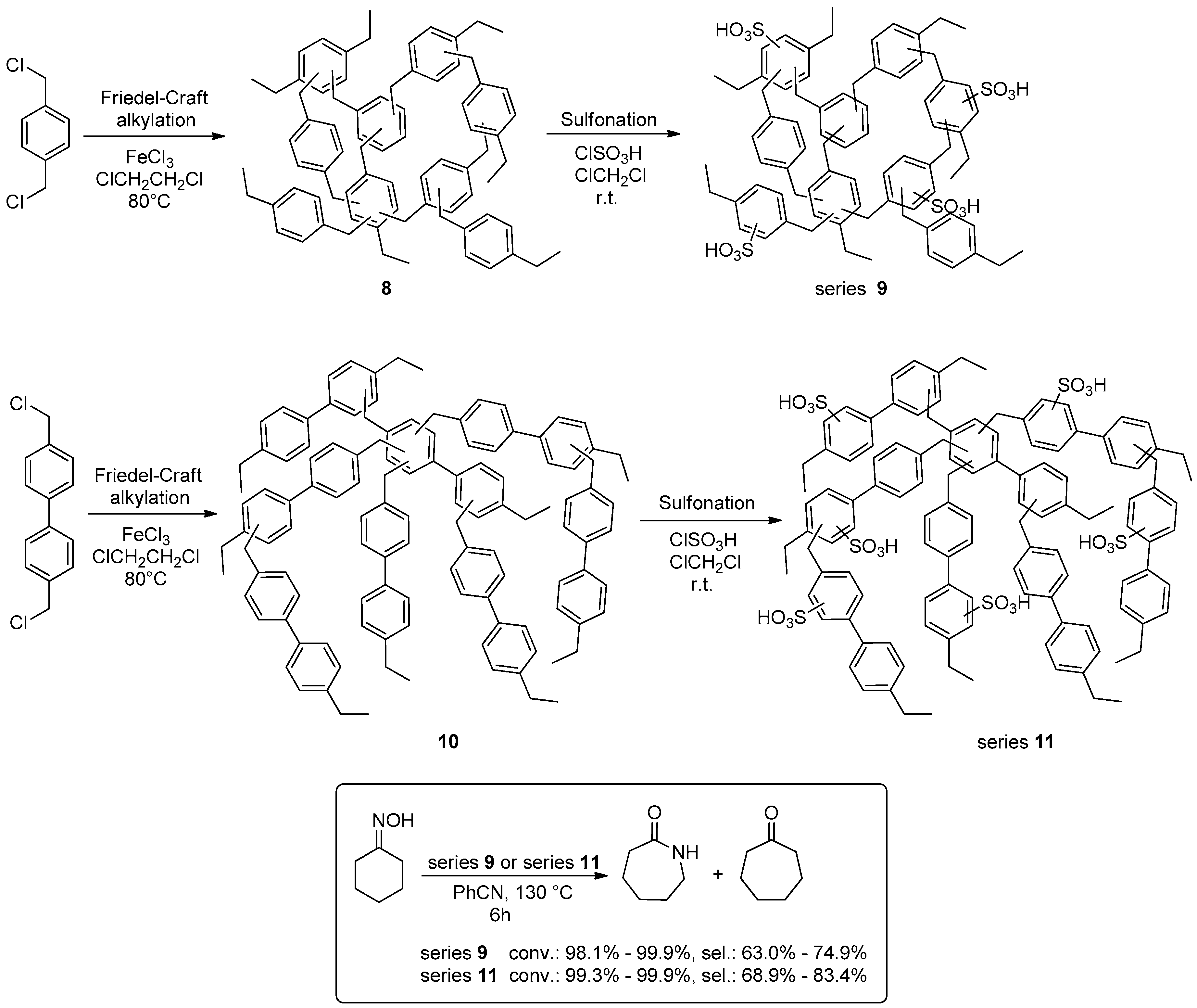 Two series of sulfonic acid-functionalized porous hyper-crosslinked polymers, denoted as series 9 and series 11, were synthesized in two synthetic steps (Scheme 5) [12]. The first step was the self-condensation of the rigid bischloromethyl monomers, α,α′-dichloro-p-xylene (for the series 9) or 4,4′-bis(chloromethyl)-1,1′-biphenyl (for series 11), via FeCl3-induced Friedel-Crafts alkylation. The second step consisted in the treatment of each material 8 or 10 synthesized in the first step, with a variable amount of ClSO3H (2, 4, 8, 16 mL per gram of porous hypercrosslinked polymer) thus obtaining the two series of materials 9 or 11, respectively. All the SO3H-functionalized solid acids presented high conversions (98.1%–99.9%) in the Beckmann rearrangement of cyclohexanone oxime in benzonitrile at 130 °C after 6 h.