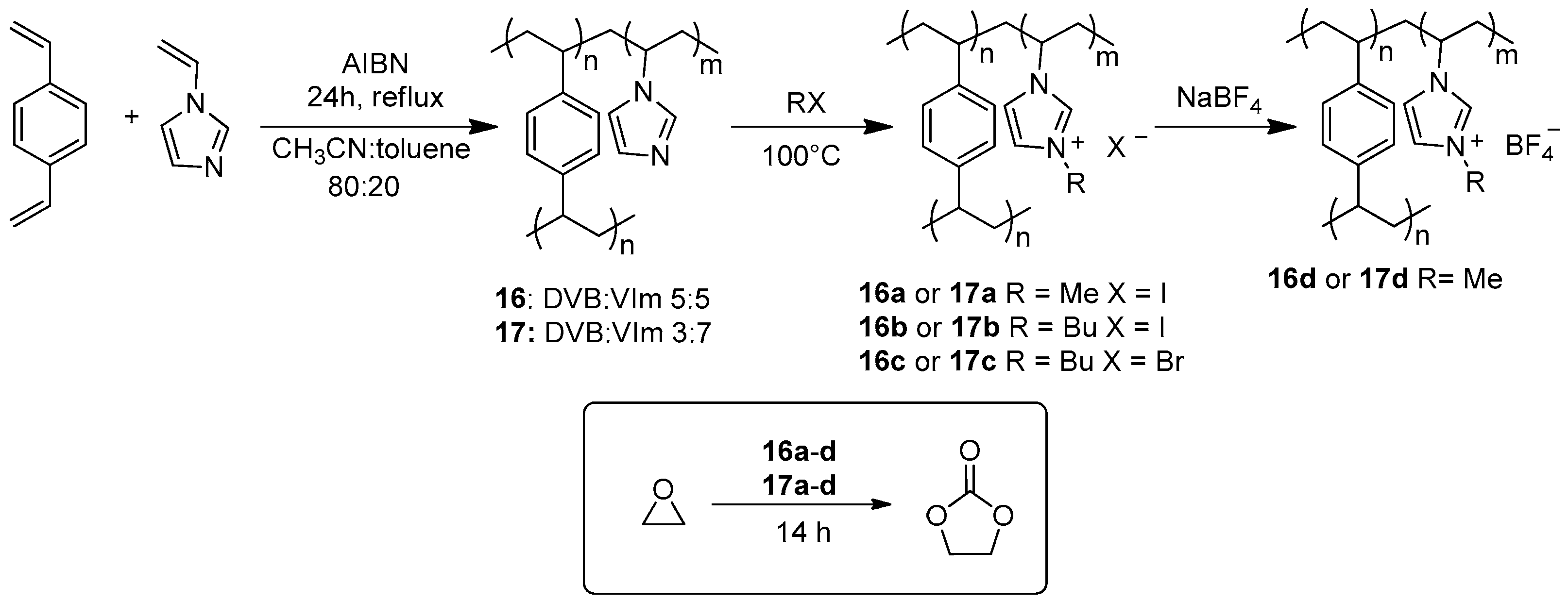 Dani et al. developed a systematic approach to understand the relation between structure of porous PILs and their properties, by testing a set of porous PILs as catalysts in the coupling reaction between CO2 and ethylene oxide under very mild conditions (room temperature and low pressure) by means of in-situ FTIR spectroscopy within 14 h of reaction [16]. In this regard, the series of porous PILs, 16a–d and 17a–d (Scheme 8), were prepared through alkylation of non-ionic co-polymers 16–17 synthesized by a precipitation polymerization method using vinylimidazole (VIm) as functional monomer and DVB as cross-linking agent. Polymers 16 and 17 were obtained at volume ratio of DVB:VIm of 5:5 and 3:7, respectively. The effect of the counter anion (I−, Br− and BF4−), the length of the alkyl chain (methyl and butyl) and the cross-link degree were investigated. The catalytic performances of PILs depended on the presence of a sufficient surface area and were proportional to the VIm content. The catalyst activity increased with increasing the nucleophilicity of the anion (I− > Br−) and length of alkyl chains, that stabilized the imidazole cation and reduced the electrostatic attraction between the ion-pair, so that the anion was more available to catalyse the reaction. PILs with BF4− showed no activity due to the low nucleophilicity of BF4− anion, whose high delocalized charge was not sufficient to allow the ring opening of ethylene oxide. Non-ionic co-polymers 16–17 showed very low activity. Finally, the catalytic activity of Poly(mVIm+I−) was very low, despite the higher concentration of active sites, as a consequence of the absence of porosity and then of the low accessibility to the active sites.