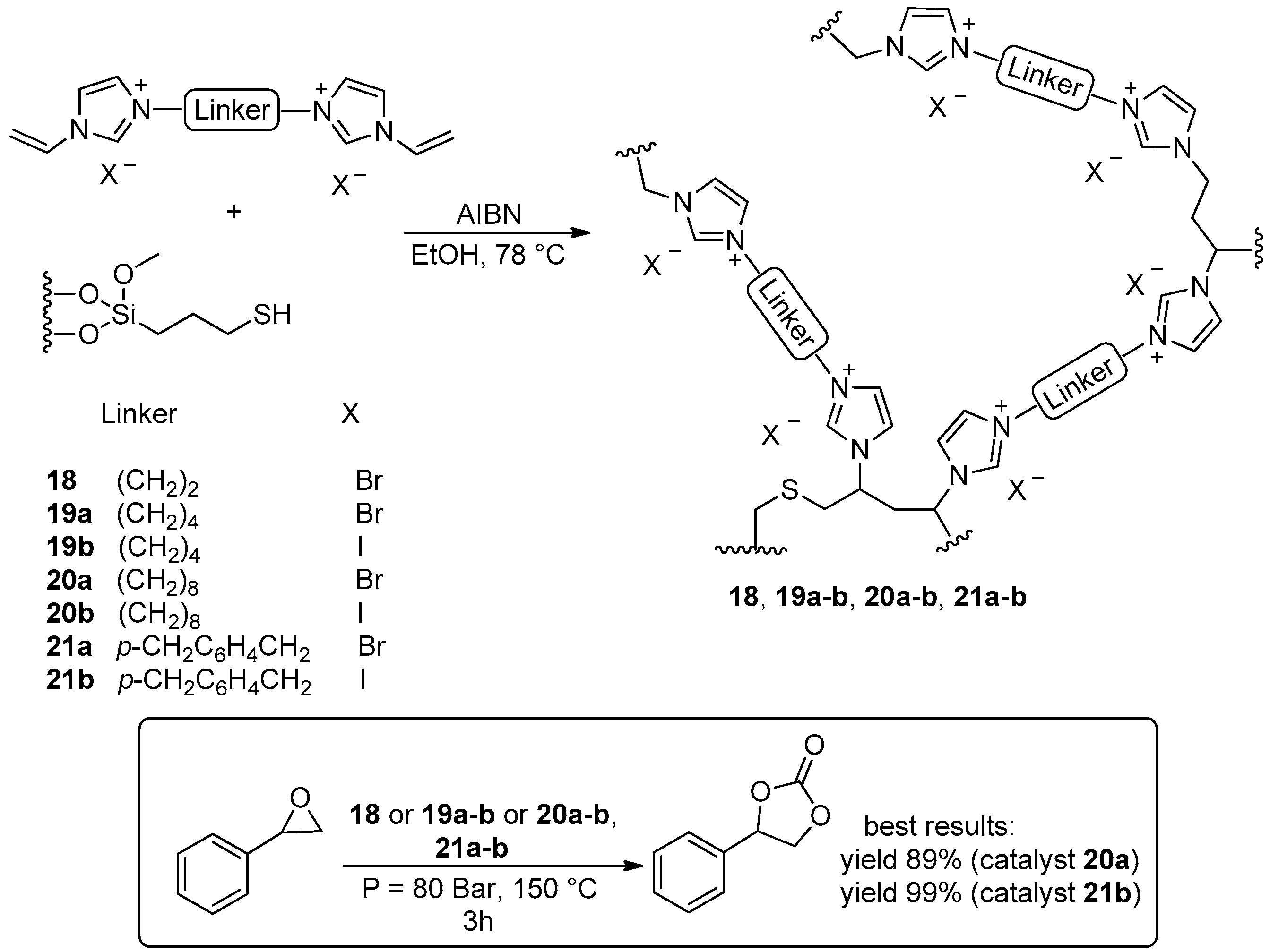 In 2014, a series of multilayered covalently-supported ionic liquid phase (mlc-SILP) materials 18, 19a–b, 20a–b, 21a–b were synthesised by grafting different bis-vinylimidazolium salts on thiol-functionalised silica (Scheme 9) [17]. Covalently-supported imidazolium salts represent an interesting class of recyclable catalysts with excellent stability and durability [18,19]. Bis-imidazolium salts with different organic linkers (ethane, butane, octane, p-xylene) between the two imidazolium units and two types of halides as counterions (X = Br or I) were used. Since the materials were synthesized using an excess of bis-imidazolium salts with respect to the SH groups of thiol-functionalized silica, a cross-linked oligomeric network of imidazolium units on the silica support was obtained. The catalytic activity of materials 18, 19a–b, 20a–b, 21a–b was valued and compared in the coupling reaction between CO2, under supercritical conditions, and two different epoxides, an aliphatic terminal epoxide (1,2-epoxyhexane) and an aromatic terminal epoxide (styrene oxide). With all catalysts, higher epoxide conversions were observed with styrene oxide as compared to 1,2-epoxy-hexane.