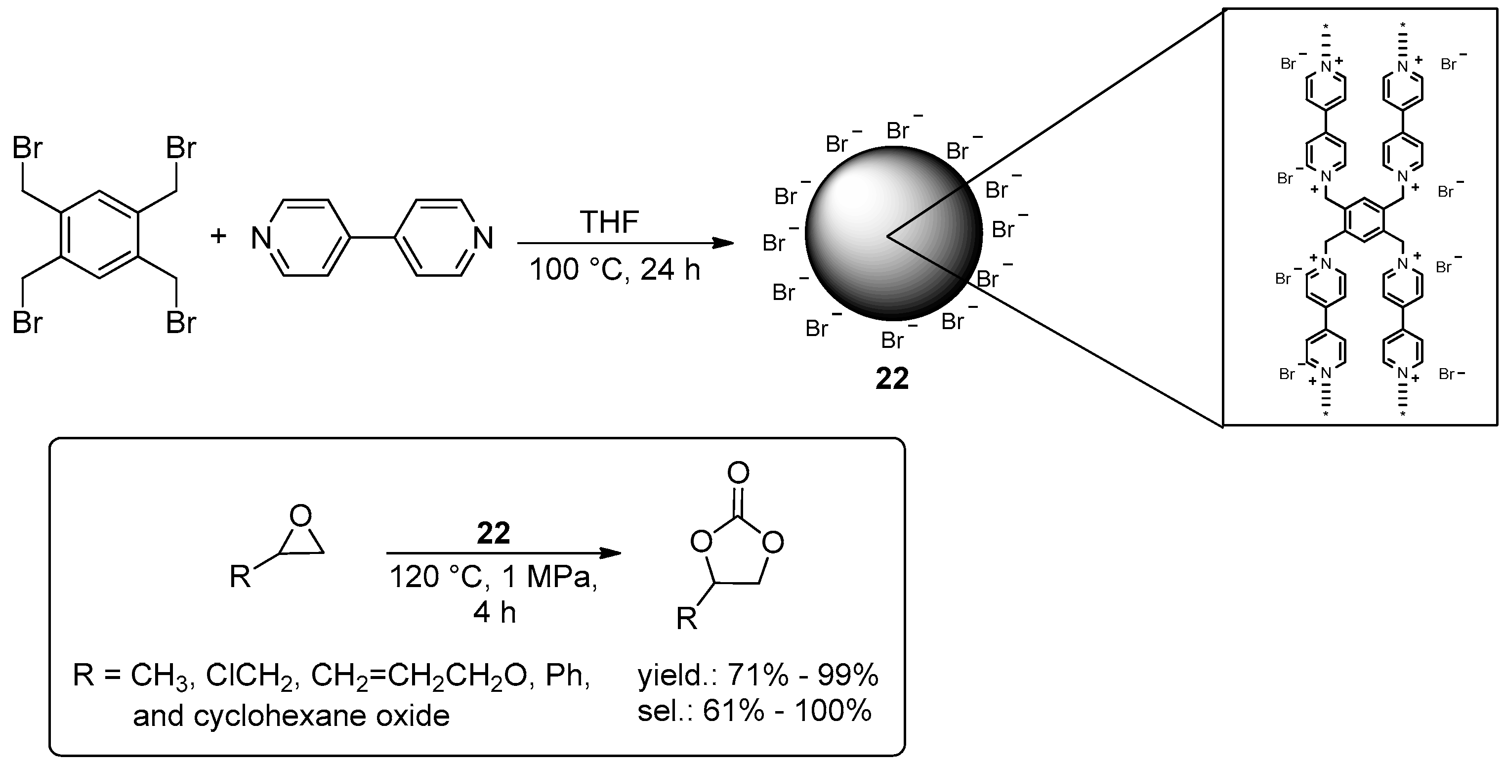 Recently, a new type of stable highly cross-linked cationic polymer microspheres, denoted as 22, was solvothermally synthesized from the reaction of 1,2,4,5-tetrakis(bromomethyl)benzene and 4,4′-bipyridine (Scheme 10) [21]. Various solvents, including THF, toluene, acetonitrile, and ethyl acetate were applied. The spherical particles 22 (with sizes of approximately 2–3 nm) formed in THF were the most stable and exhibited high activity and selectivity in the coupling reaction between CO2 and different substituted epoxides at 120 °C under metal-free and solvent-free conditions. In addition, spherical particles 22, insoluble in the reaction system, had good recyclability, which was mainly attributed to the cross-linked covalent cationic structure. After the reaction, the cross-linked cationic polymer microspheres 22 could be easily recycled by filtration or centrifugation and reused six successive times without a significant decrease in the efficiency or structural deterioration.