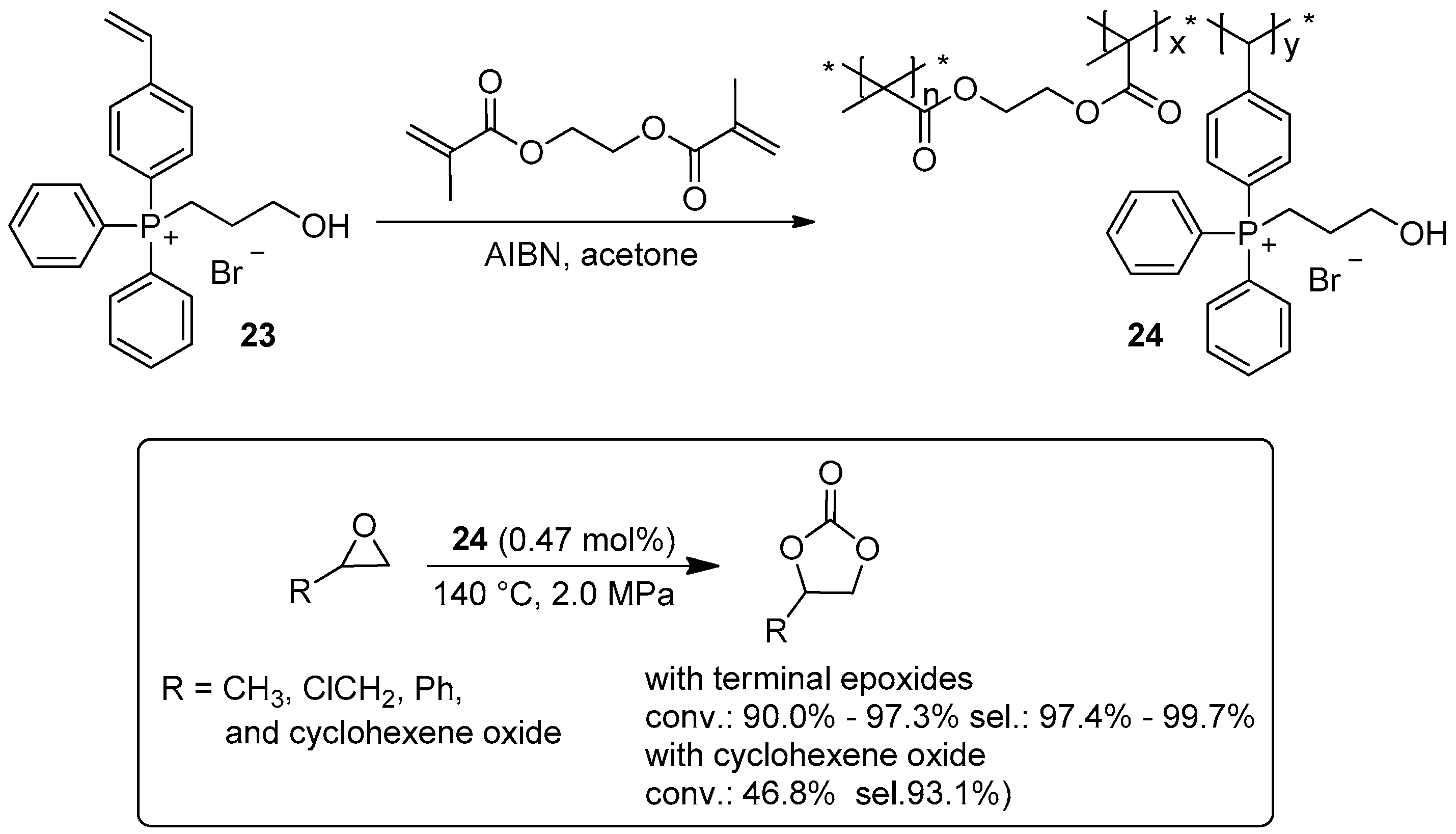 Preparation of phosphonium-based poly(ionic liquid) 24 and its use as catalyst in the synthesis of cyclic carbonates.