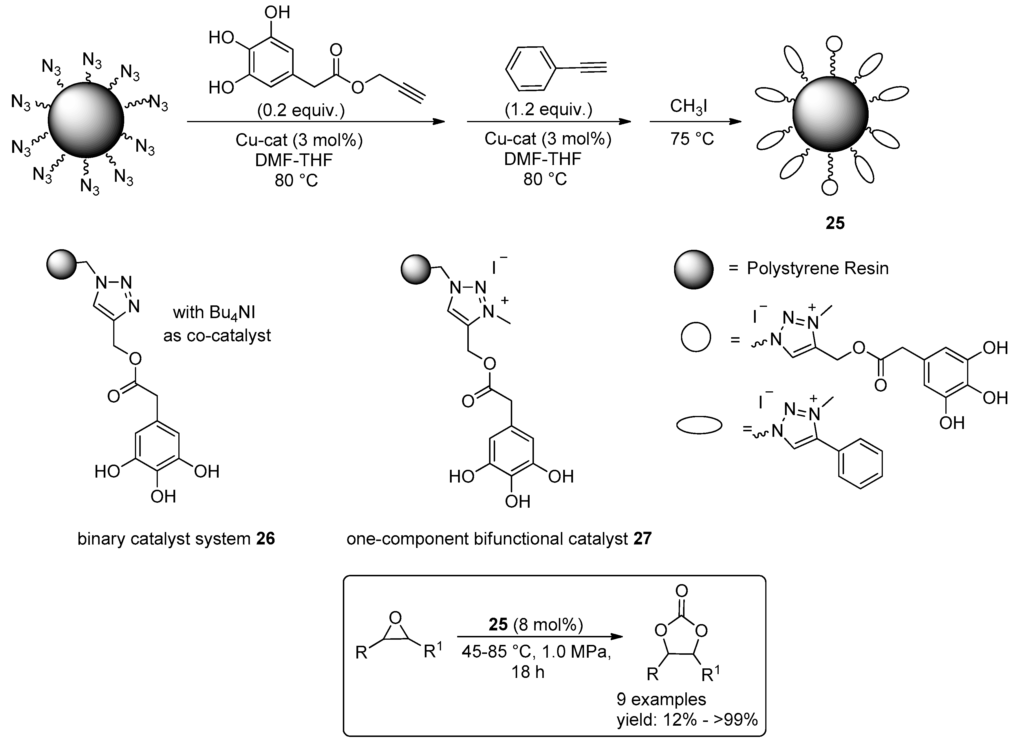 Most immobilized organocatalyst systems for the conversion of epoxides to cyclic carbonates, require operating temperatures above 100 °C, which challenges their overall sustainability. The following example reports a recyclable catalyst system that promotes the conversion of CO2 under mild conditions. The bifunctional catalyst 25, where the triazolium and pyrogallol units were linked to distinct positions along the polymer backbone, was prepared starting from azidomethyl polystyrene and tested as catalyst in coupling reaction between CO2 and 1,2-epoxyhexane at 45 °C (Scheme 12) [24].