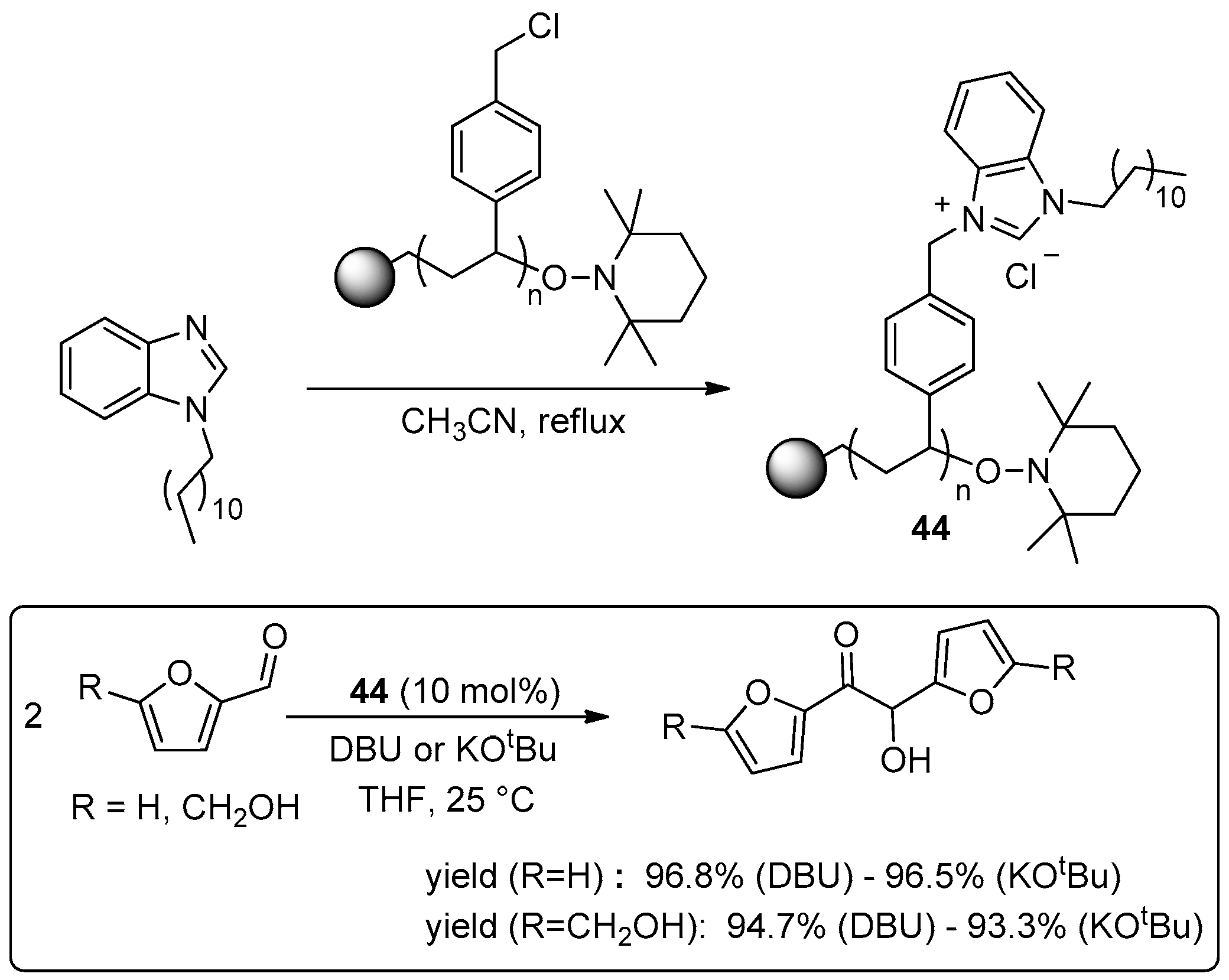 Benzimidazolium pre-catalyst 43b, carrying a long-chain (C12) substituent, showed the best catalytic activity, producing furoins with high yields (94.3%–96.6%). According to the authors, the higher activity of 43b could be attributed to presence of sterically demanding substituents, that facilitated the shift of the Wanzlick equilibrium (equilibrium between the carbene and its corresponding dimer) toward the formation of free carbenes [35]. The long-chain alkyl group placed in the proximity of the carbene center could also provide a hydrophobic protection pocket for the catalyst to minimize its decomposition or poisoning caused by adventitious protic or oxidative sources. After this preliminary study, the Merrifield’s peptide resin, an organic support, was utilized to synthesize the grafted salt pre-catalyst 44 (Scheme 19) [34]. 1-Dodecylbenzimidazole, prepared from reaction between benzimidazolide and dodecyl bromide, was grafted onto the Merrifield’s peptide resin through alkylation of the 1-dodecylbenzimidazole with the benzyl chloride functional group contained in the resin. In presence of DBU or KOtBu, the pre-catalyst 44 showed excellent catalytic activity in the self-coupling reaction of furfural (96.8% yield with DBU and 96.5% with KOtBu) and in the self-coupling reaction of 5-hydroxymethylfurfural (94.7% with DBU and 93.3% with KOtBu). Both catalytic systems 43b and 44 showed excellent recyclability in furfural self-coupling without loss of the catalytic activity after ten cycles. This result was obtained by adopting a catalyst recycling procedure that involves activation of the pre-catalyst with a base to generate the NHC catalyst and recycle of the catalyst by quenching the reaction with HCl to convert the catalyst back to the pre-catalyst.