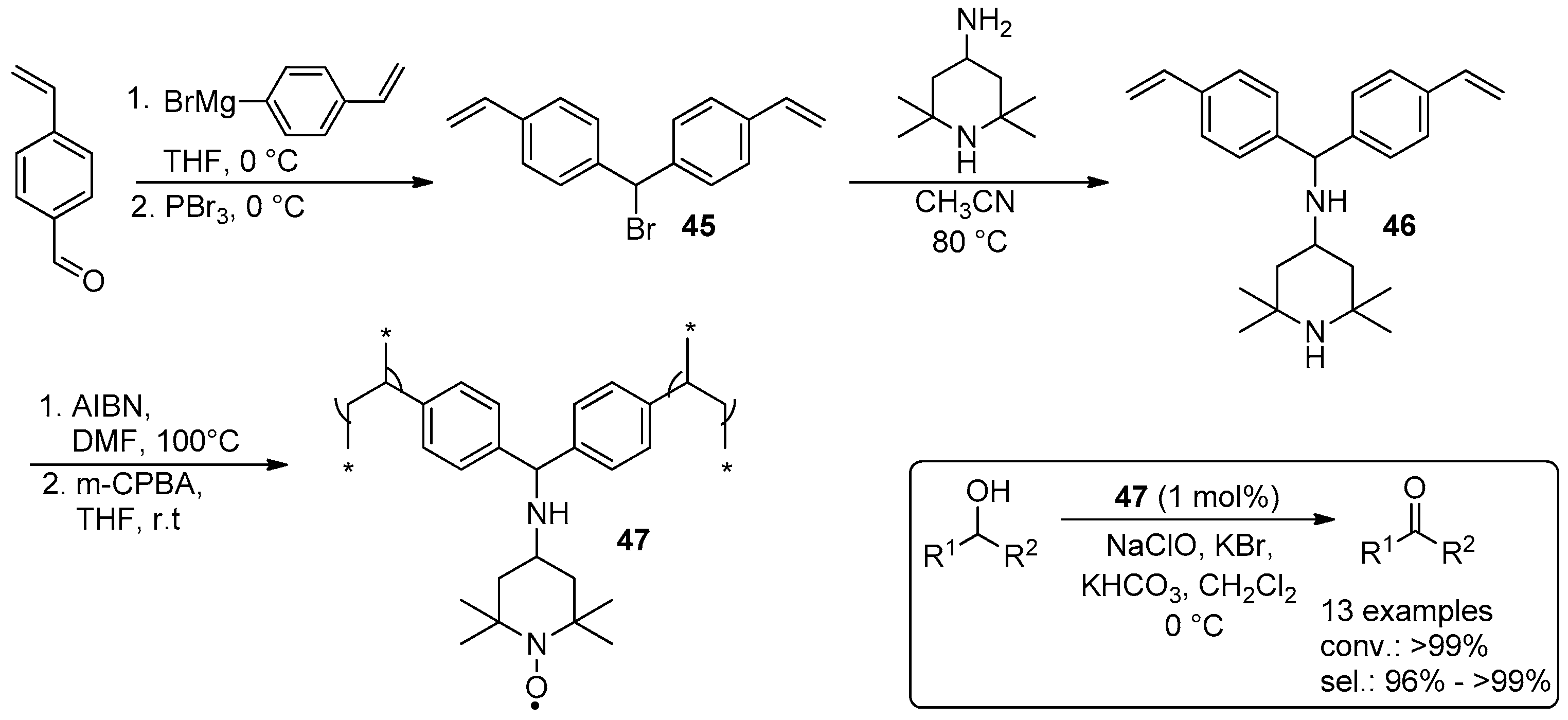 A new porous polymerized organocatalyst with high surface area, hierarchical porosity, and superior chemical stability was prepared and employed as an efficient heterogeneous catalyst in the oxidation of alcohols. In detail, the porous polymerized organocatalyst 47 was synthesized from solvothermal polymerization of vinyl-functionalized 2,2,6,6-tetramethylpiperidine monomer 46 in the presence of AIBN at 100 °C, followed by oxidation with m-chloroperbenzoic acid (m-CPBA) (Scheme 20) [36]. Monomer 46 was synthesized by nucleophilic substitution reaction between 2,2,6,6-tetramethyl-4-piperidylamine and 4,4′-(bromomethylene)-bis(vinylbenzene) (45), previously prepared starting from 4-vinylbenzaldehyde. The use of 1 mol % of 47 in oxidation of various substituted alcohols at 0 °C led to the corresponding aldehydes and ketones with very high conversions (>99%) and selectivities (96%–>99%). The reaction with benzyl alcohol was also carried out with 0.1 mol % and 0.05 mol % of catalyst, obtaining a conversion of 99% after 10 and 20 h respectively. Furthermore, catalyst 47 was more active than TEMPO immobilized on MCM-41 [37]. The same conversions were achieved using polymers with superior surface area, obtained by copolymerization of monomer 46 and divinylbenzene. Catalyst 47 was used for five cycles without significant loss of activity.