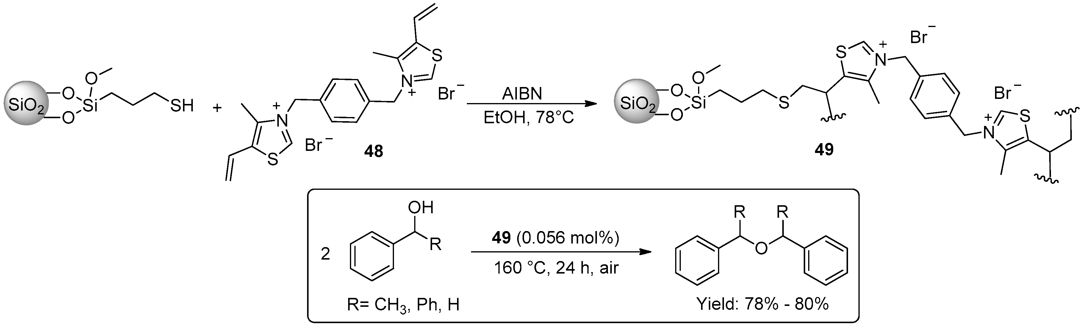 The first application of thiazolium-based compounds as catalysts for the etherification reaction of alcohols was reported [38]. Thiazolium hybrid material 49 was prepared by a radical reaction between a mercaptopropyl-modified SBA-15 mesoporous silica and large excess of bis-vinyl-thiazolium salt 48 (Scheme 21) and successively employed in the etherification reaction of 1-phenyl-ethanol under solvent-free conditions at 160 °C testing different gas phases (oxygen, air, nitrogen and argon). After 24 h, an almost quantitative conversion (93%) was observed in both oxygen and air with a better selectivity toward ether in air (86%) than oxygen (73%). Under a nitrogen or argon atmosphere, a decrease of conversion (55%, 57% respectively) and an increase of selectivity (93%, 91% respectively) were observed. Furthermore, thiazolium hybrid material 49 displayed higher conversion and selectivity compared to the analogous imidazolium-based material, thus showing that the nature of the N-heterocyclic ring had a determinant impact on the performances of the reaction.