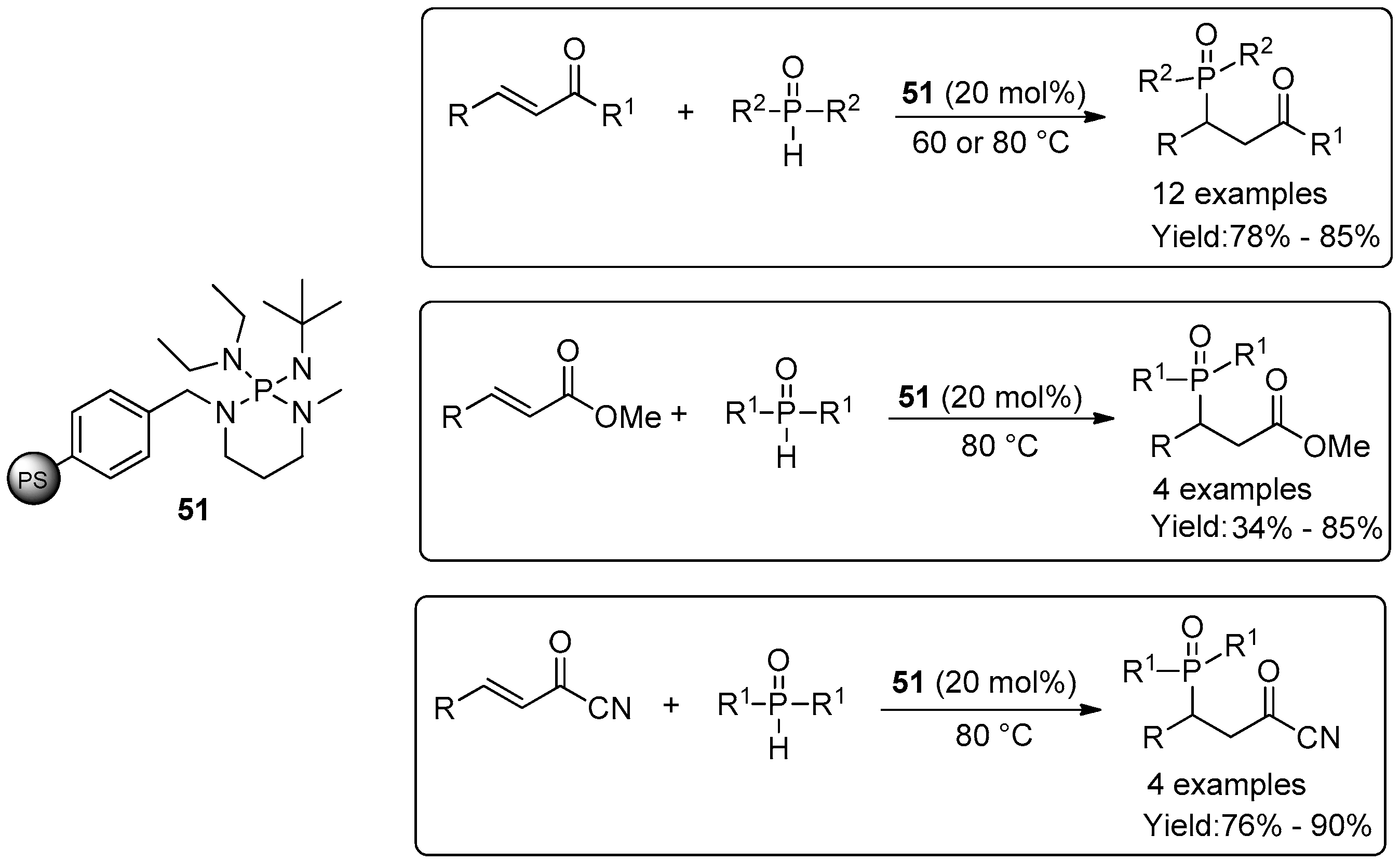 Recently, Vaccaro et al. reported the first application of a supported base as catalyst for the phospha-Michael addition of phosphorus nucleophiles to a variety of electron-poor alkenes [43]. The synthesis of different types of diethyl and dimethyl phosphonates under solvent free conditions in presence of 20 mol % of dimethylperhydro-1,3,2-diazaphosphorine-supported on polystyrene (PS-BEMP) 51 [44,45] as heterogeneous catalyst was carried out (Scheme 23). Good yields (78%–85%) were obtained using two phosphorus nucleophiles, diethyl phosphite and dimethyl phosphite, and a wide array of aromatic and non-aromatic α,β-unsaturated ketones as electrophiles.