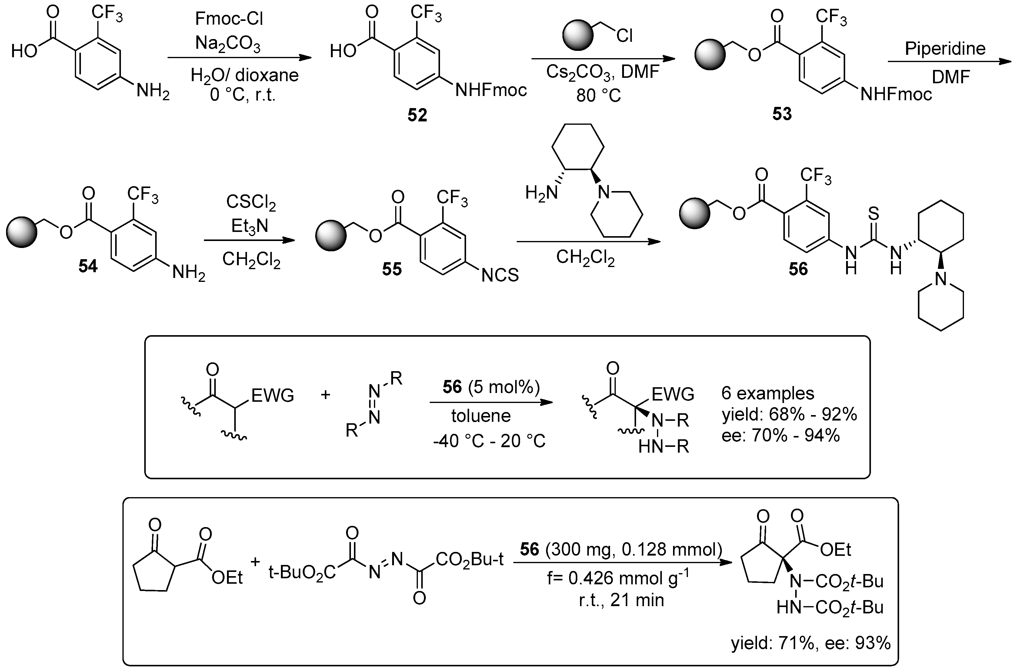 In 2015, the synthesis of polymer-supported bifunctional thiourea organocatalyst 56 and its application in the enantioselective α-amination of 1,3-dicarbonyl compounds with azodicarboxylates were investigated (Scheme 24) [48]. Catalyst 56 was prepared in few steps from 4-amino-2-(trifluoro-methyl)benzoic acid avoiding the use of linkers/spacers. The Fmoc-protected amino acid 52 was immobilized onto a 1% DVB Merrifield resin, affording the material 53, and successively was deprotected, achieving the PS-supported amino ester 54. Then, the formation of the isothiocyanate resin 55 and subsequent reaction with enantiopure (1R,2R)-2-(piperidin-1-yl)cyclohexylamine led to polymer-supported bifunctional thiourea organocatalyst 56. Catalyst 56 was tested in the enantioselective α-amination of a family of cyclic 1,3-dicarbonyl compounds with di-tert-butyl azo-dicarboxylate and diethyl azodicarboxylate. High yields and enantioselectivity values were obtained with 5 mol % of the bifunctional catalyst in toluene. Recycling experiments in the α-amination of ethyl 2-oxocyclopentanecarboxylate with diethyl azodicarboxylate were carried out. High isolated yields and ee′s were consistently recorded over nine cycles, regenerating the catalyst with triethylamine after each run. The α-amination of ethyl 2-oxocyclopentanecarboxylate with di-tert-butyl azodicarboxylate catalysed by resin 56 was also carried out in continuous flow. This experiment led to the desired product with 93% ee in 71% isolated yield with a productivity of 4.88 mmolprod mmolcat−1·h−1, a TON of 37 and the residence time of 21 min.