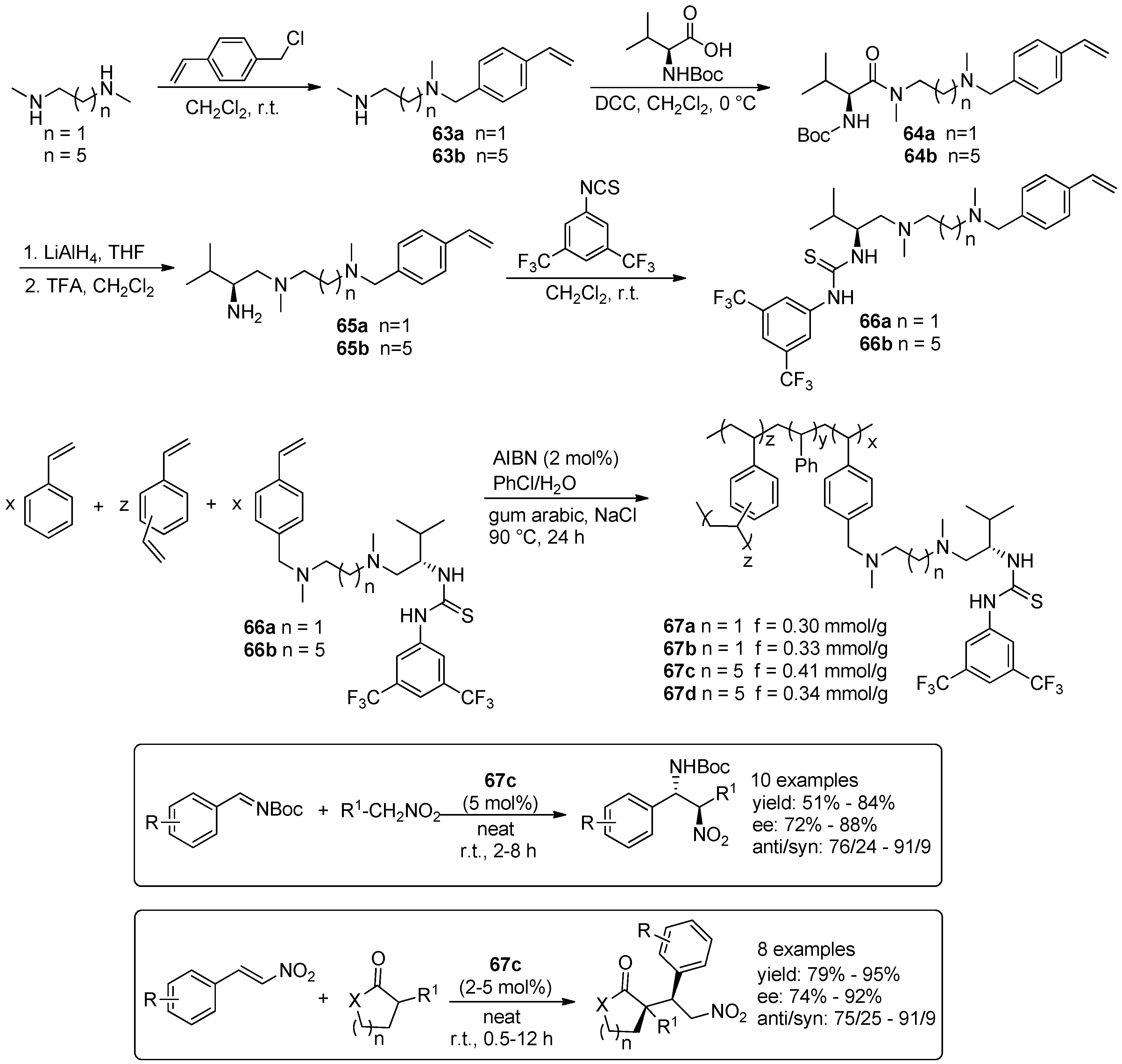 Preparation of supported thiourea-based organocatalysts 67a–d and use of 67c in aza-Henry and Michael reactions.